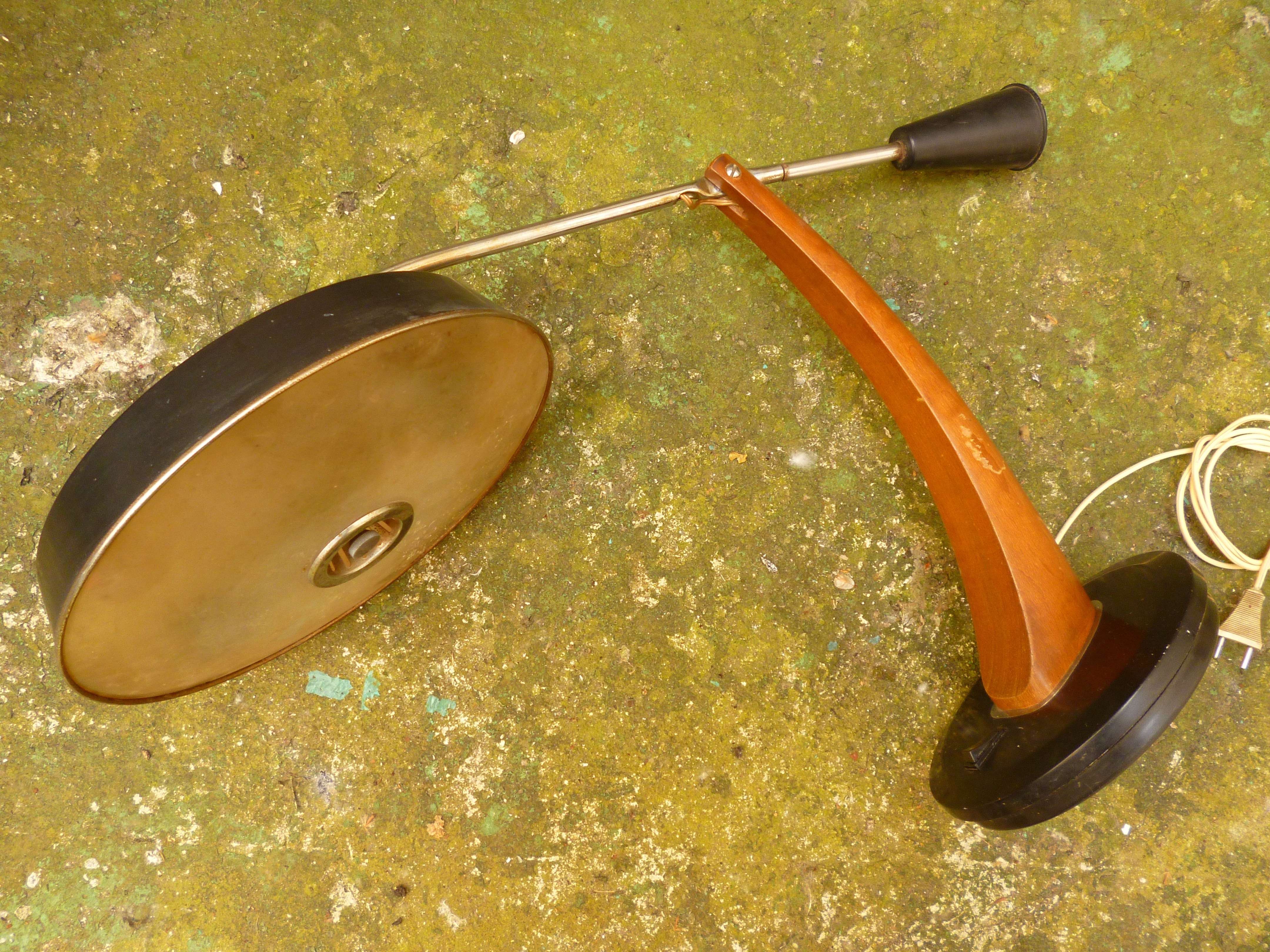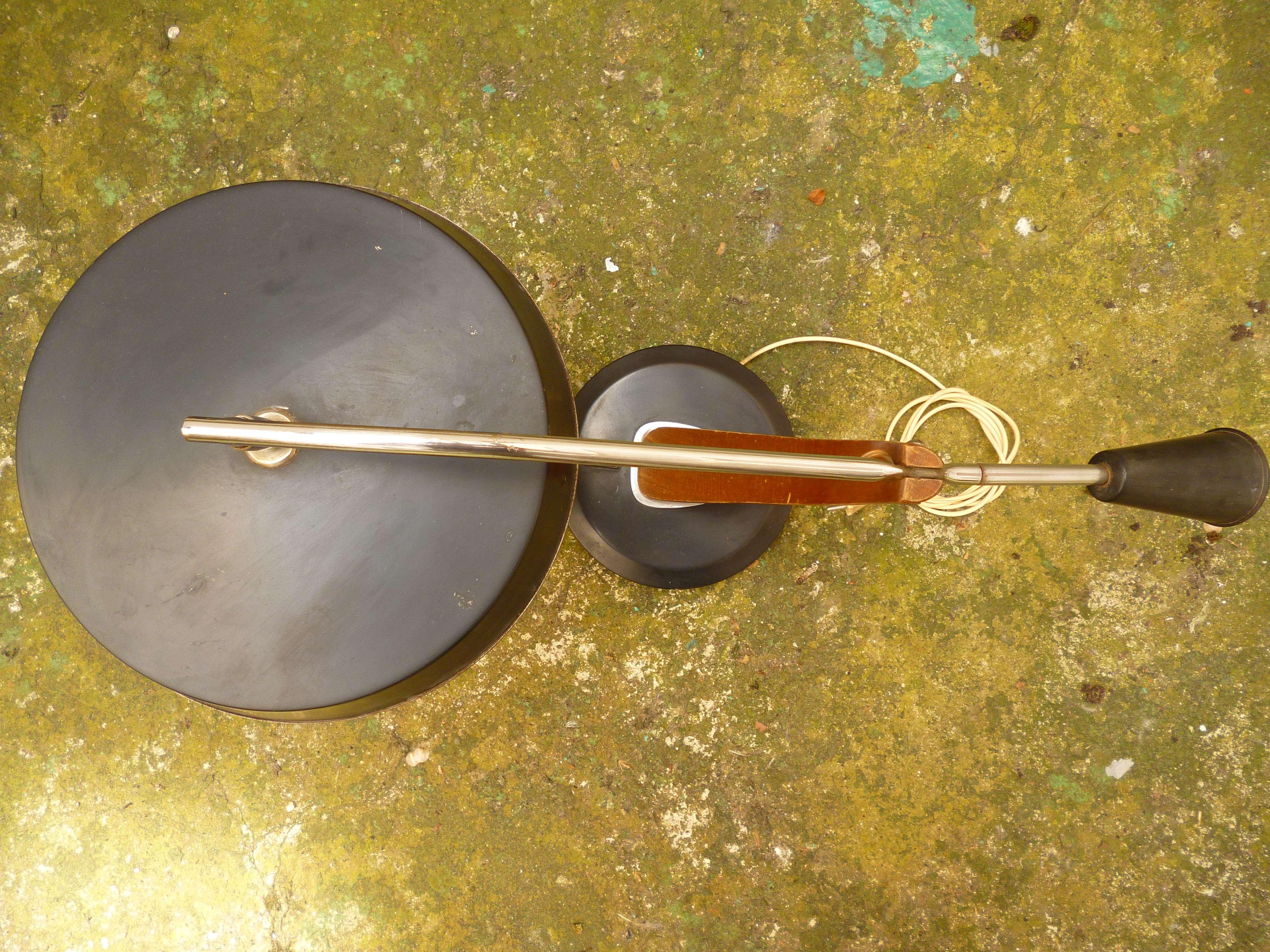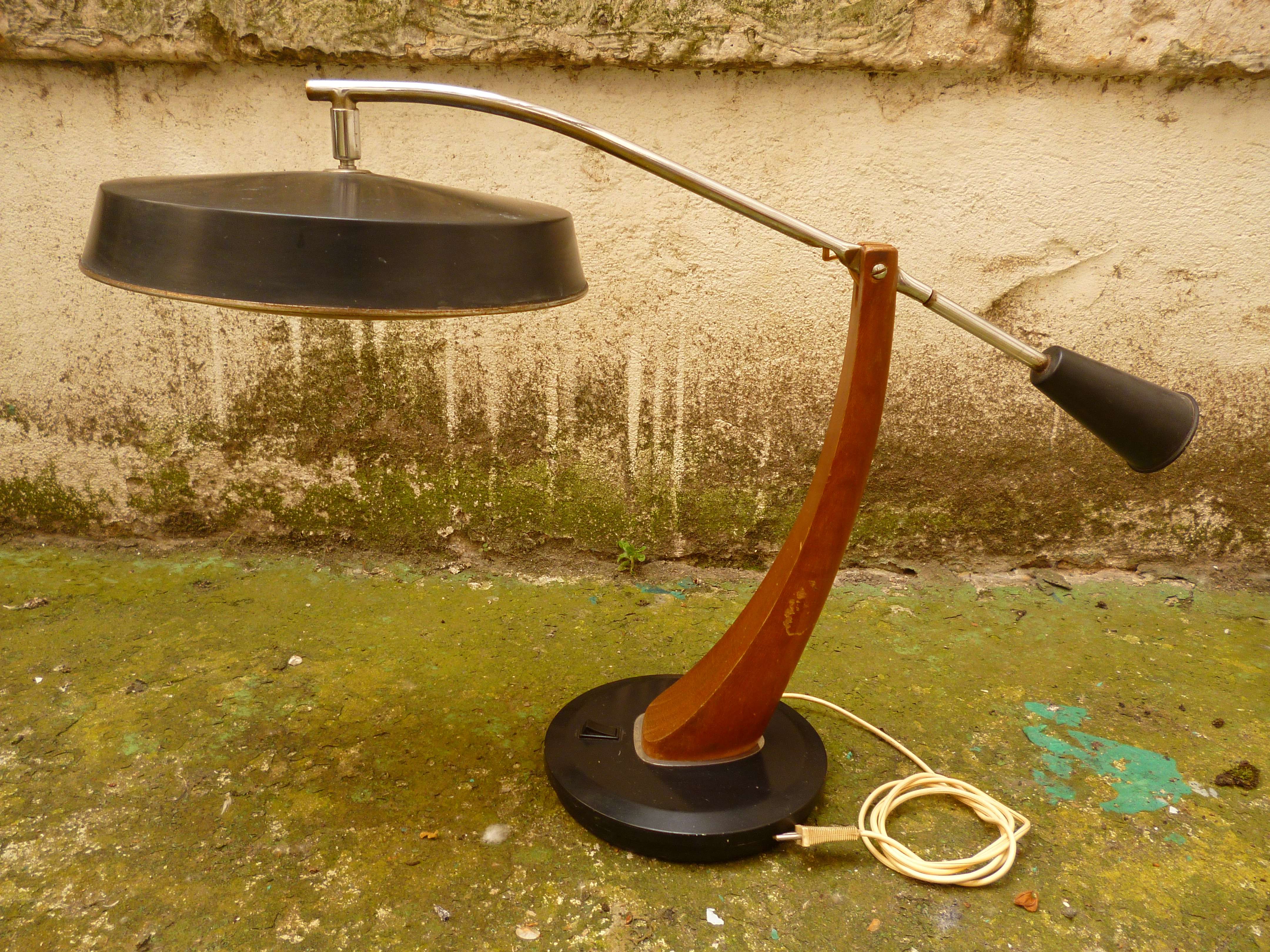- Descripción: Metal negro mate tubo cromado de pértiga con contrapeso y brazo en madera con tulipa de cristal mate años 70 base rotatoria con interruptor.