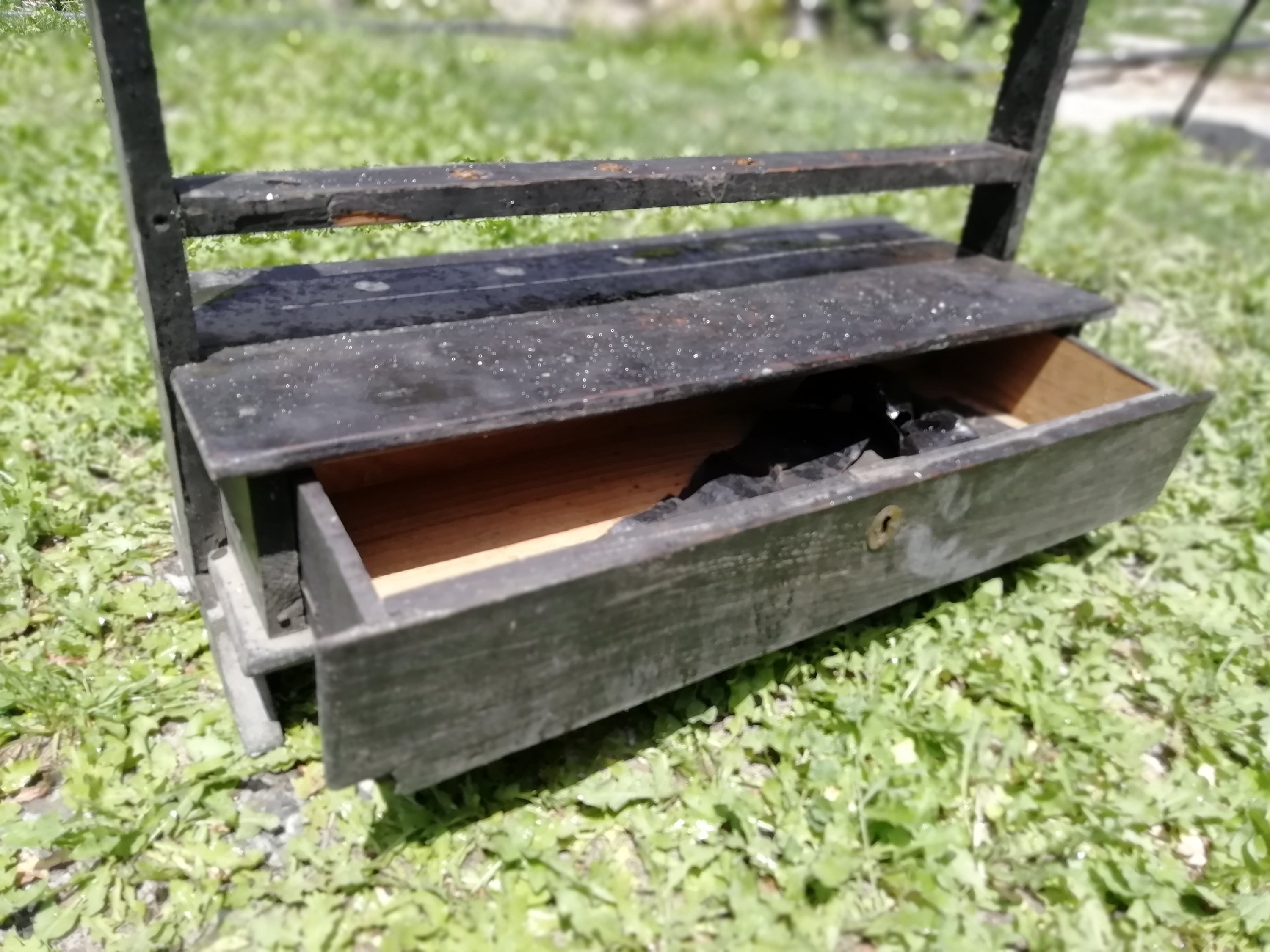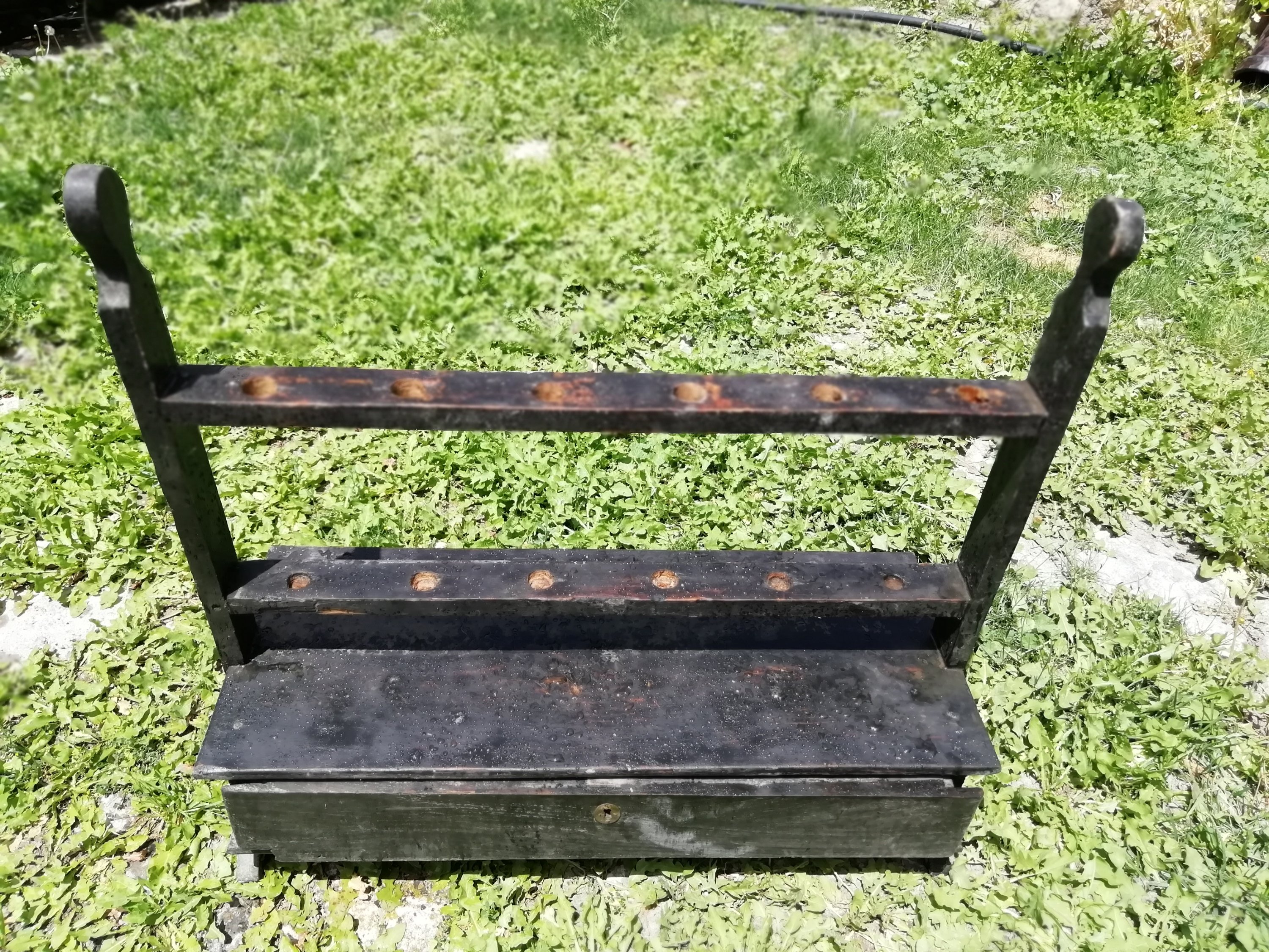 Portavelas Antiguo, de madera, decorado en negro, con cajon porta-complementos.