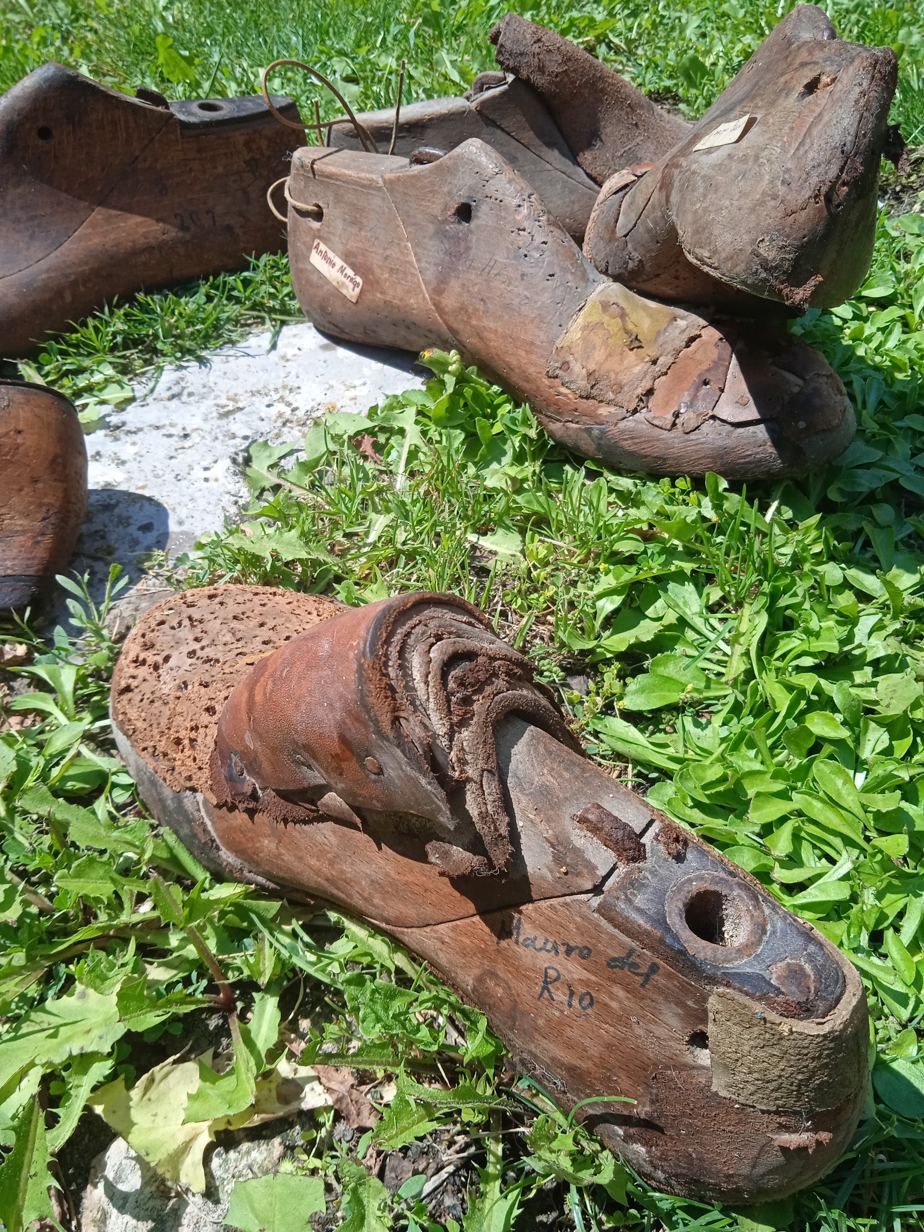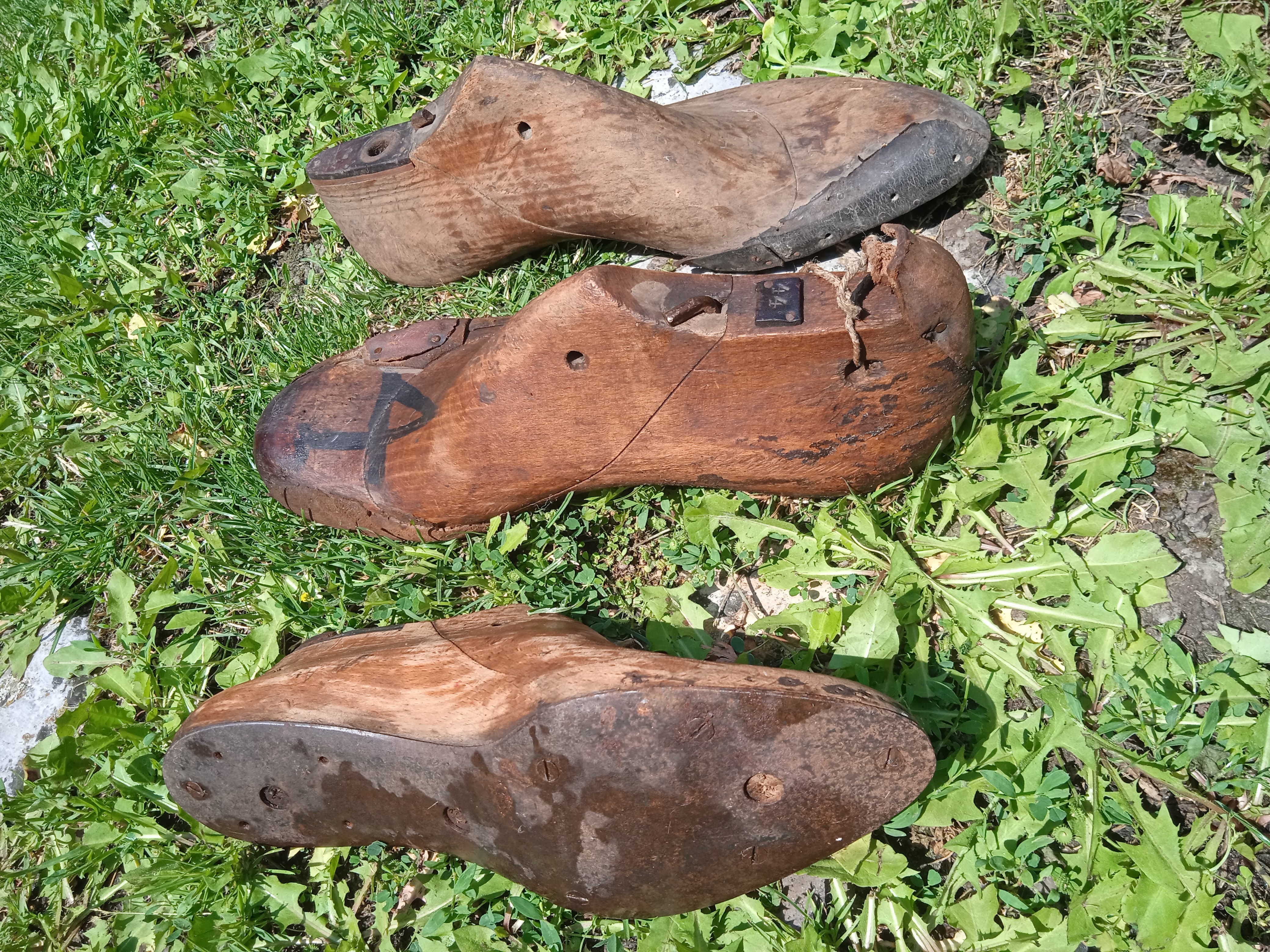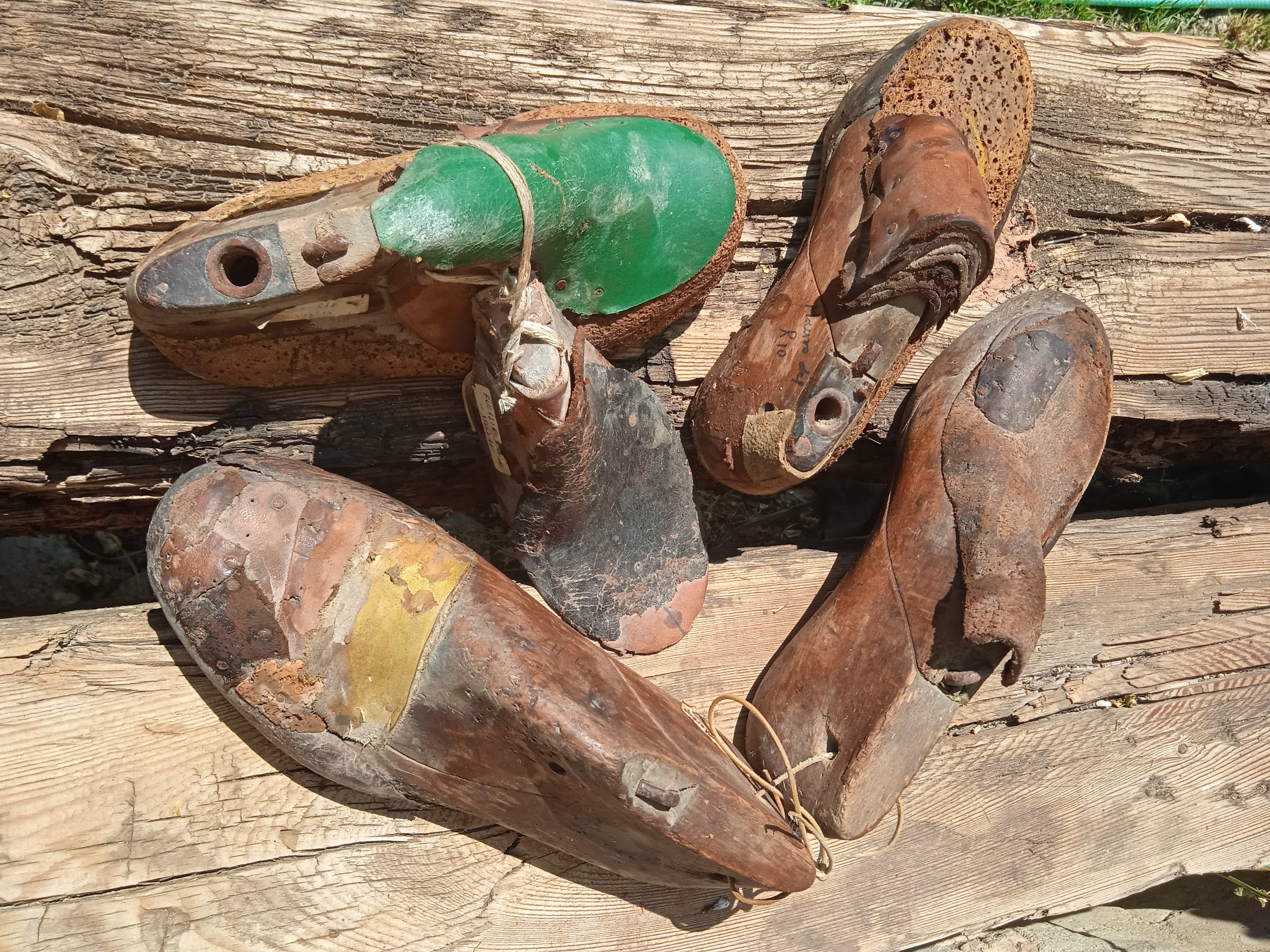 Tenemos una amplia colección de hormas de zapatos de madera antiguos consuela de hierro y aplicaciones de regulación de medida en piel.