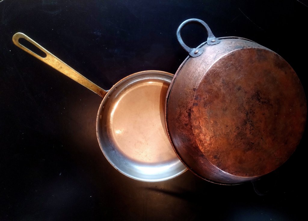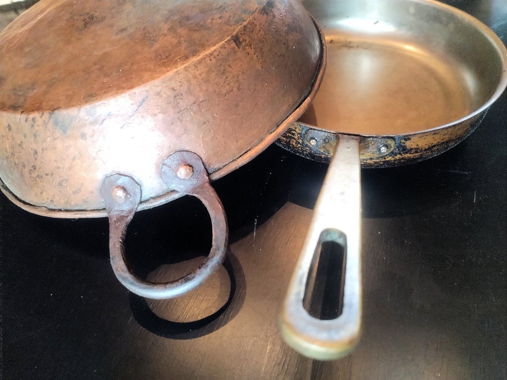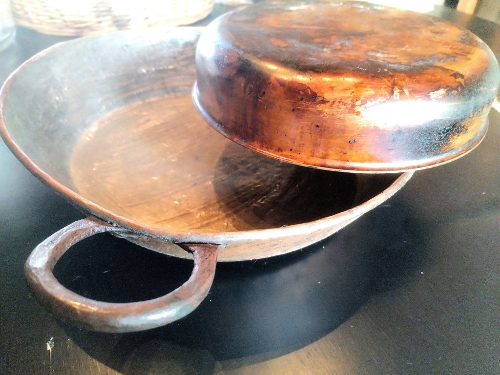 Sartén de cobre con asa de latón macizo en fundición e interior acto para cocinar.