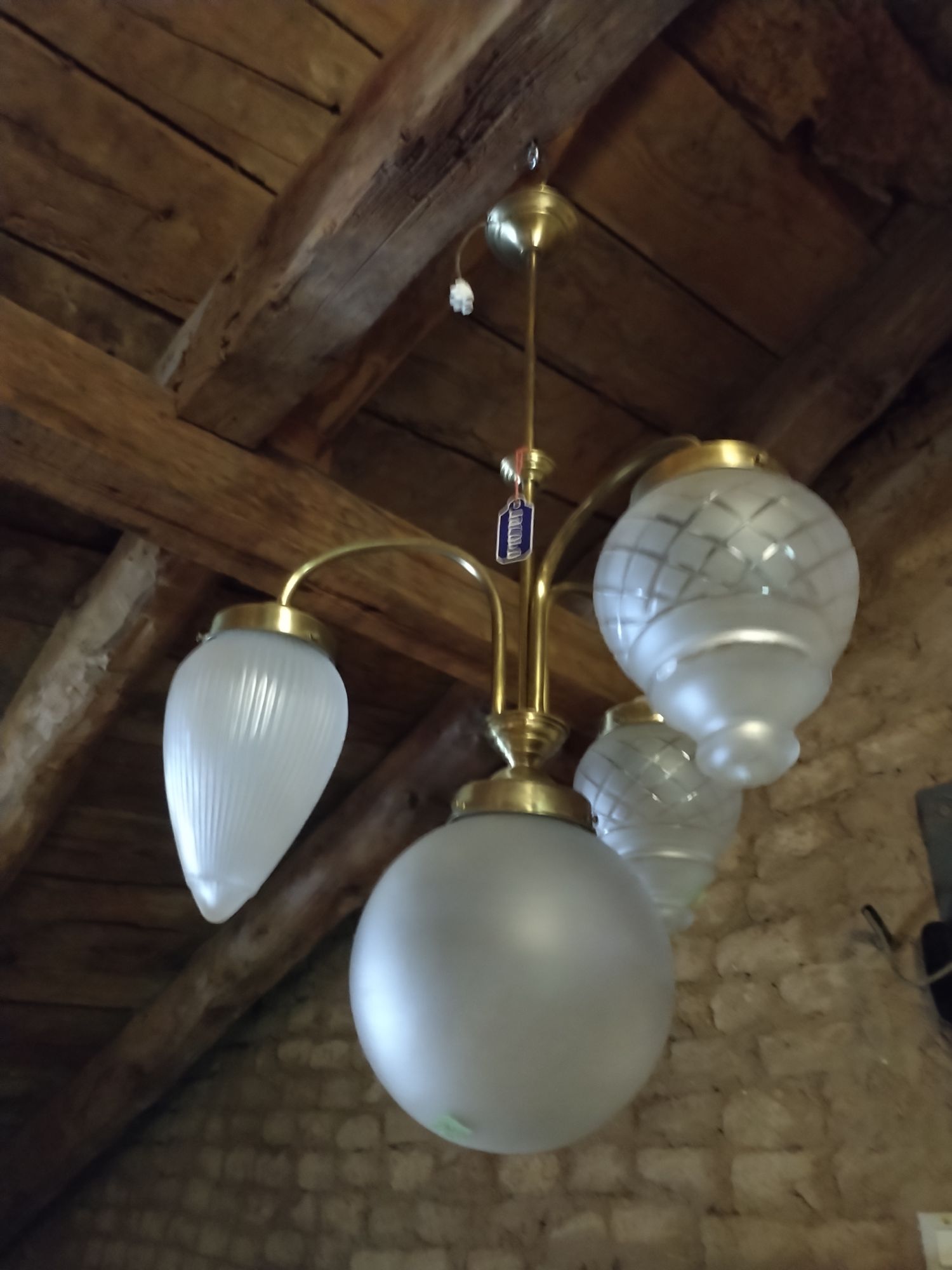 Cuatro puntos de luz con posibilidad, de combinar otras tulipas, 7’5 cm boca para tornillo ( la central + grande y con cristales colgantes )
