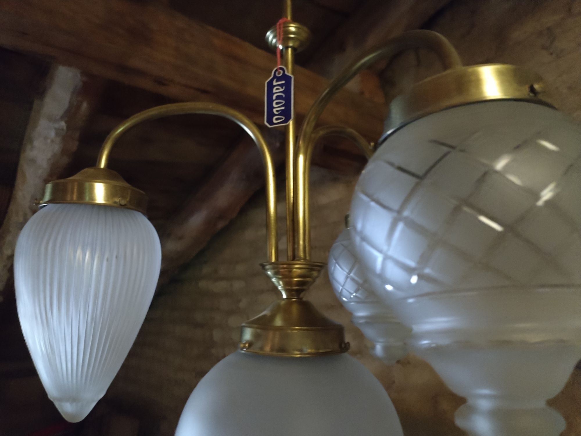 Lámpara de latón de techo, antigua con colección de tulipas antiguas artesanales.