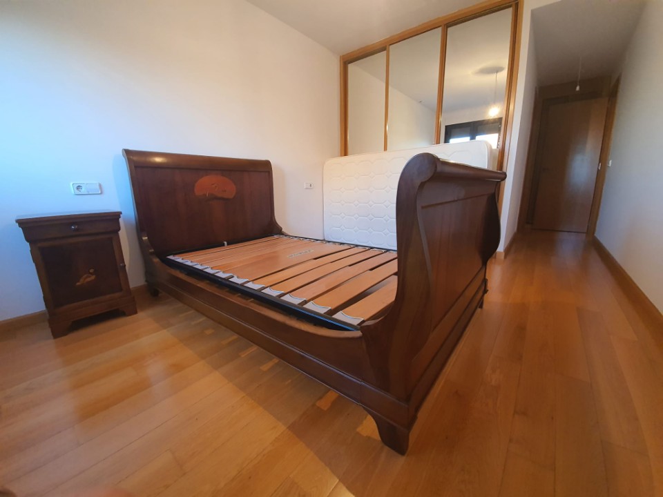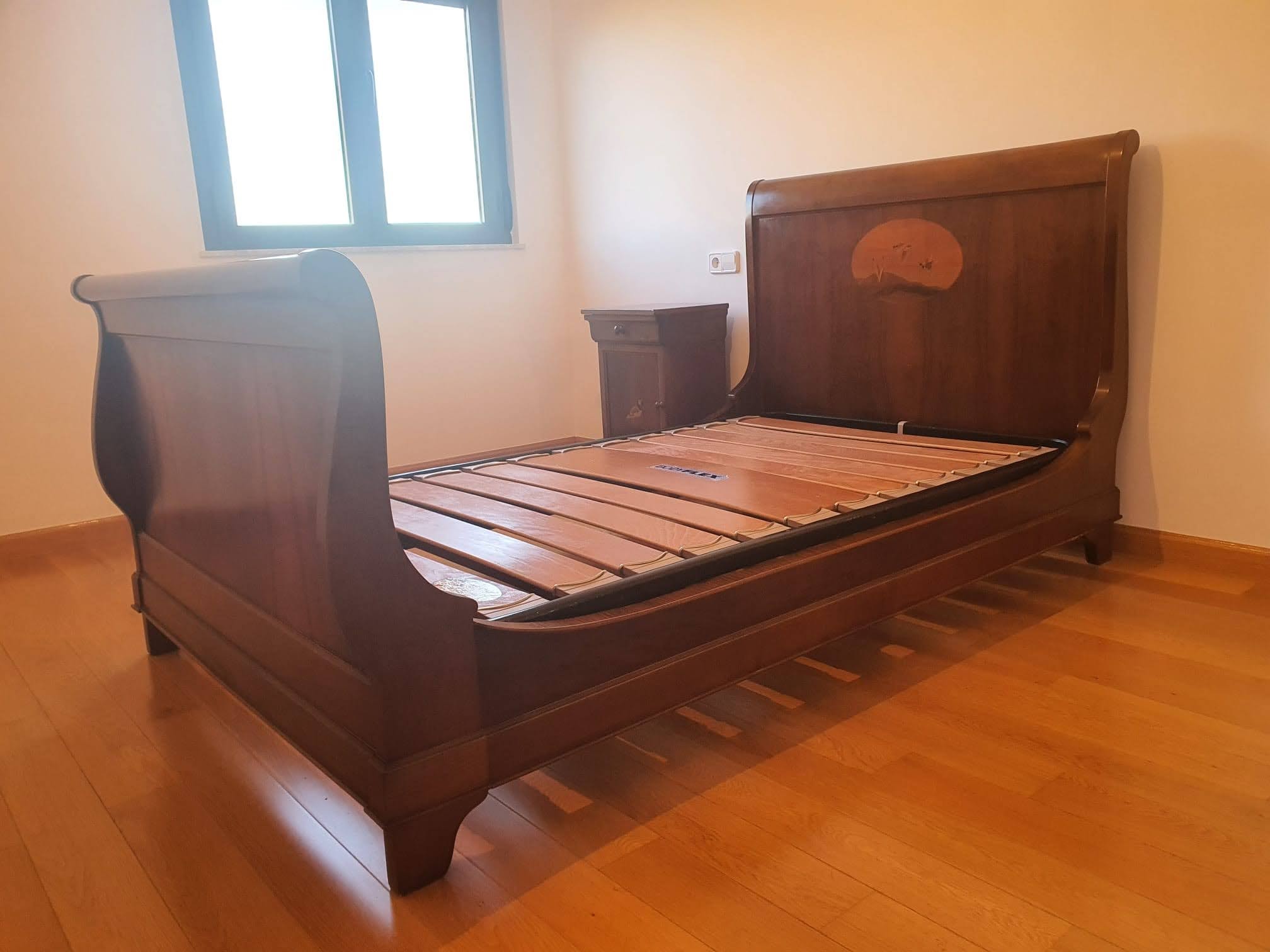 Cama de estilo barco, realizado por el fabricante Valentín en madera de nogal español, con marquetería.