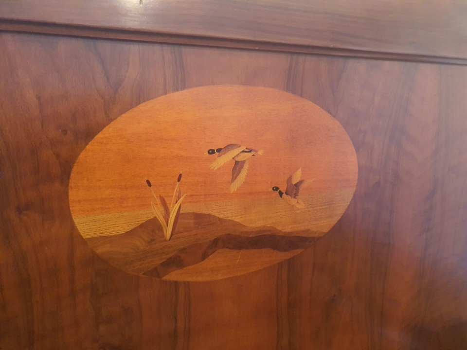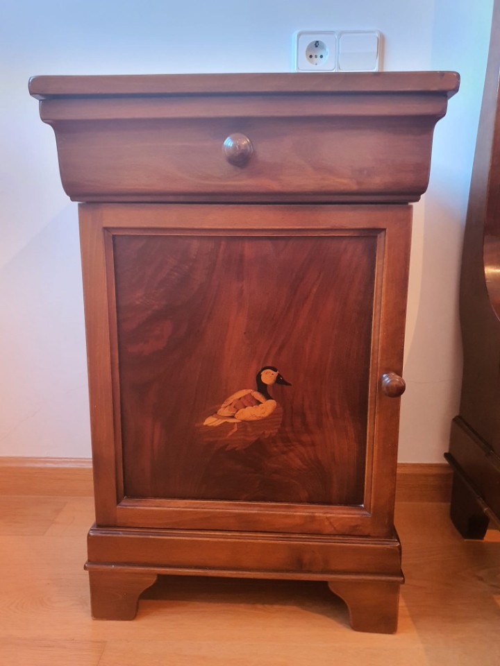 Mesilla maciza en nogal español con marquetería, con un cajón y puerta.