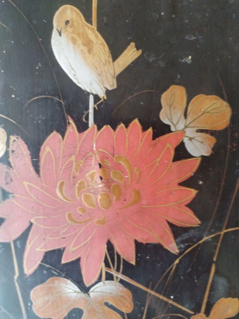Placa de madera antigua oriental con policromía artesanal pintada a mano.
