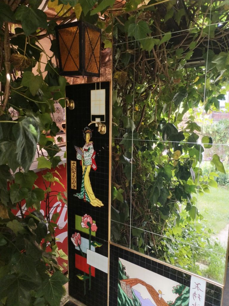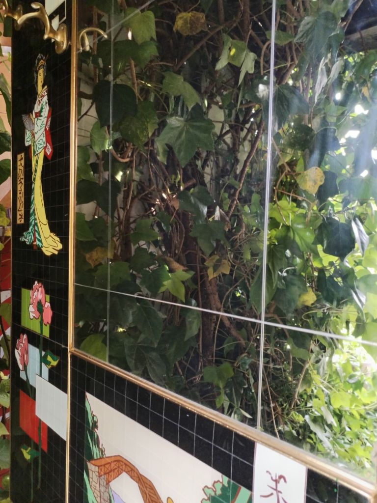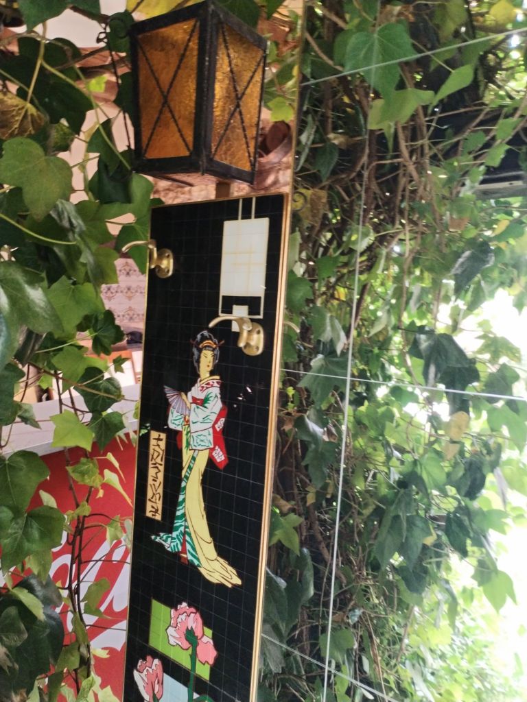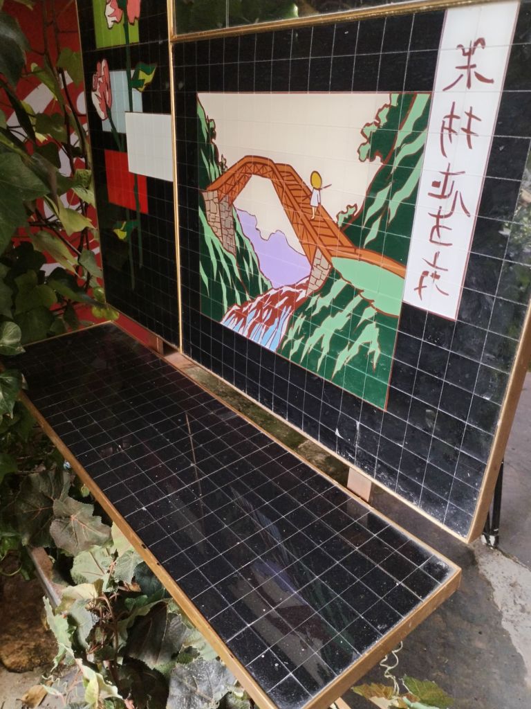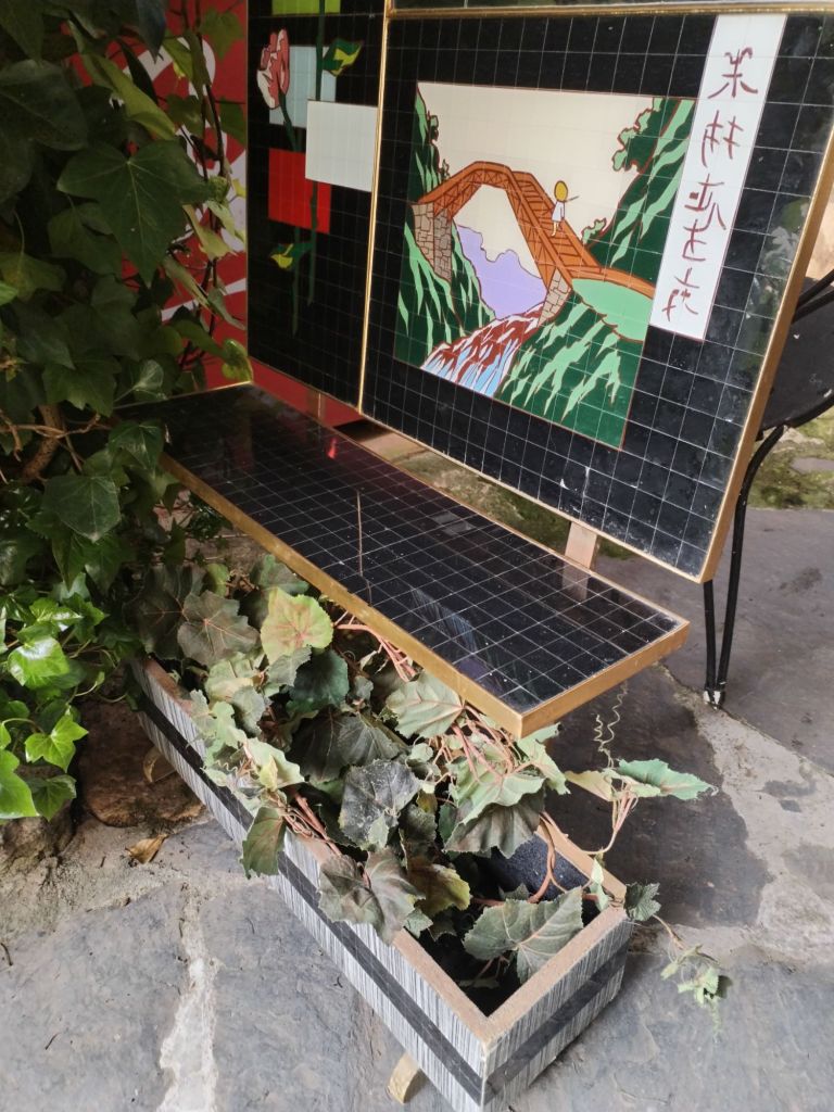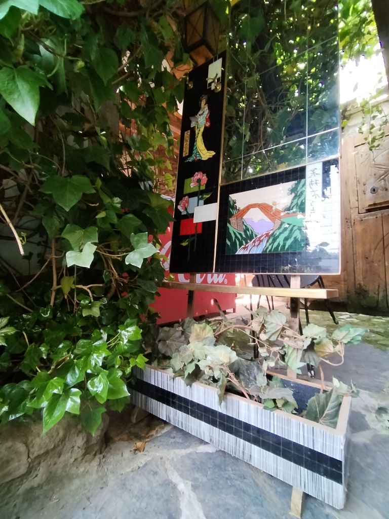 Perchero recibidor vintage de estilo oriental con mosaicos y cantos dorados.