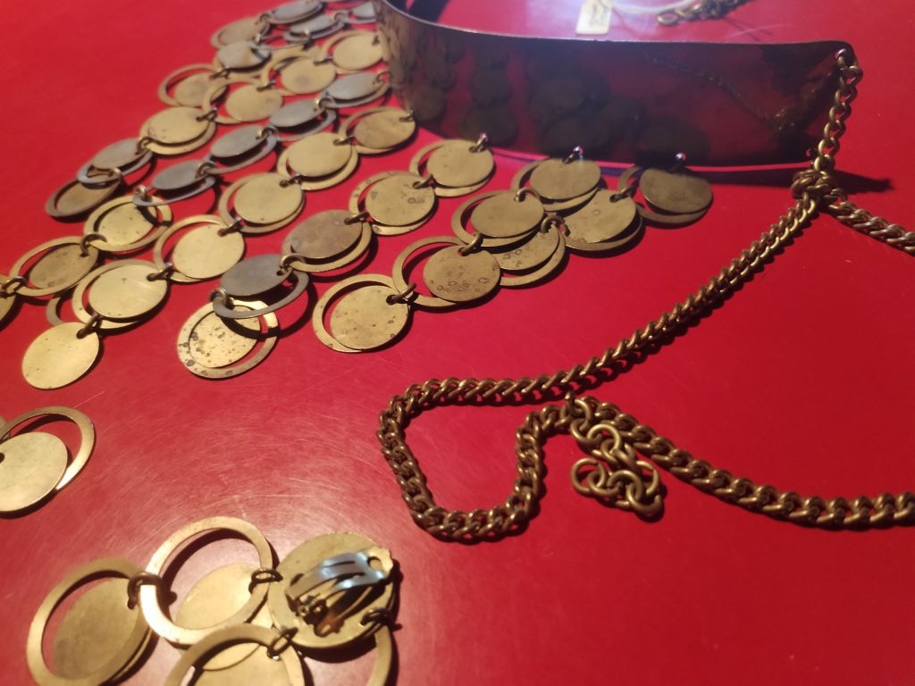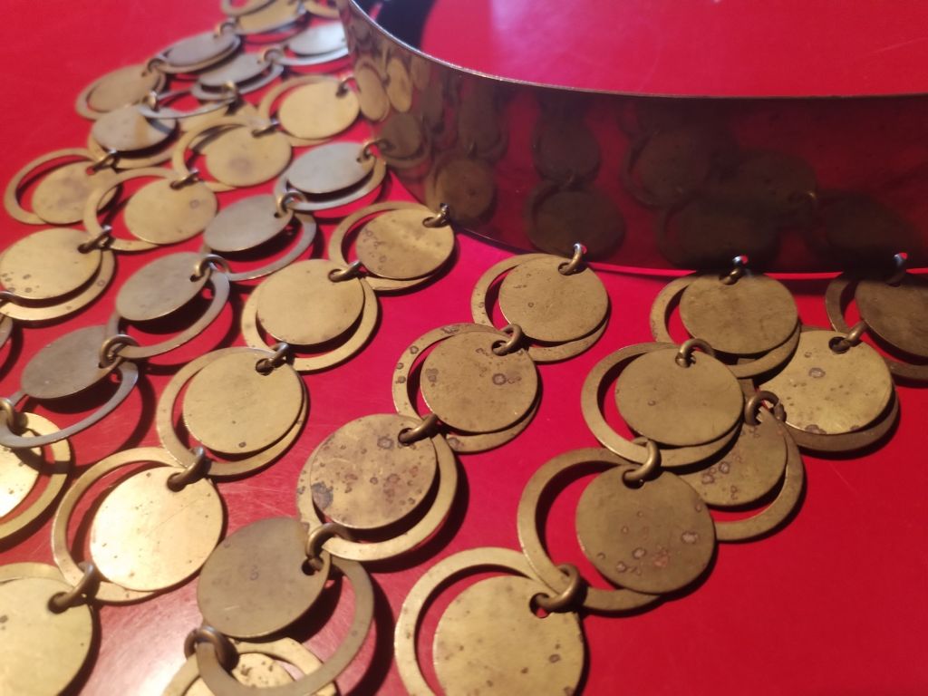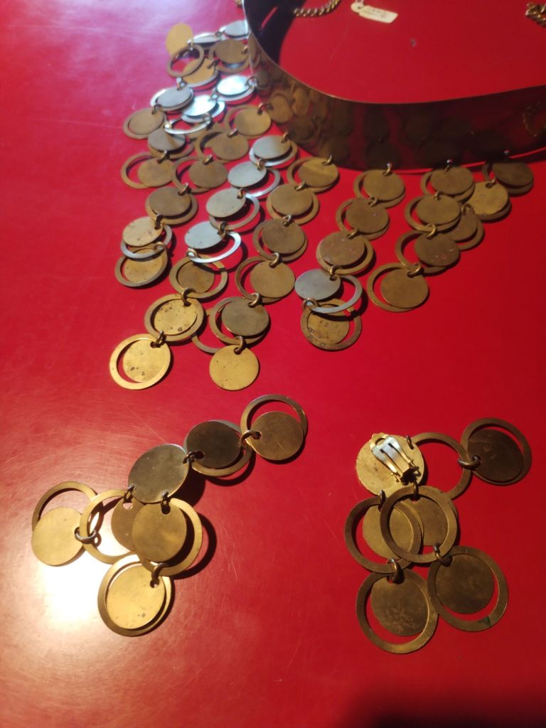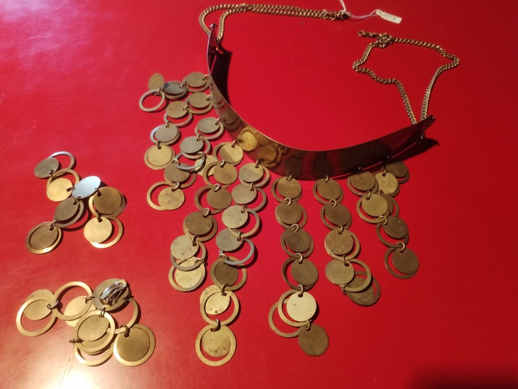 Conjunto de gargantilla y pat fe pendientes de pinza, realizada en 1970, artesanalmente en latón con círculos. concéntricos.
