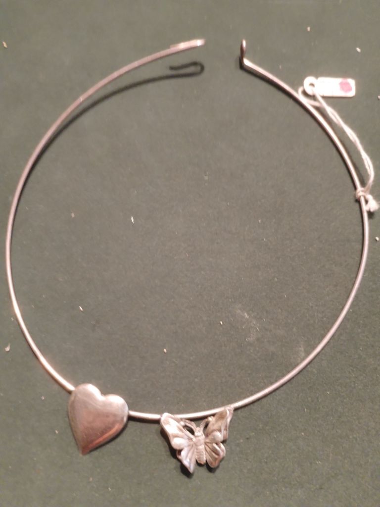 Gargantilla de plata CORAZÓN y MARIPOSA Gargantilla de plata realizada artesanalmente en los años 70. Motivo corazón y mariposa. 87 € Compártelo: Haz clic para compartir en X (Se abre en una ventana nueva) X Haz clic para compartir en Facebook (Se abre en una ventana nueva) Facebook Me gusta Cargando... Relacionado