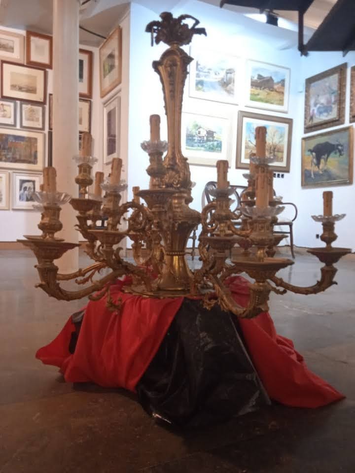 Totalmente restaurada y reinstalada, para 12 bombillas con vela y plato de cristal Tallado.