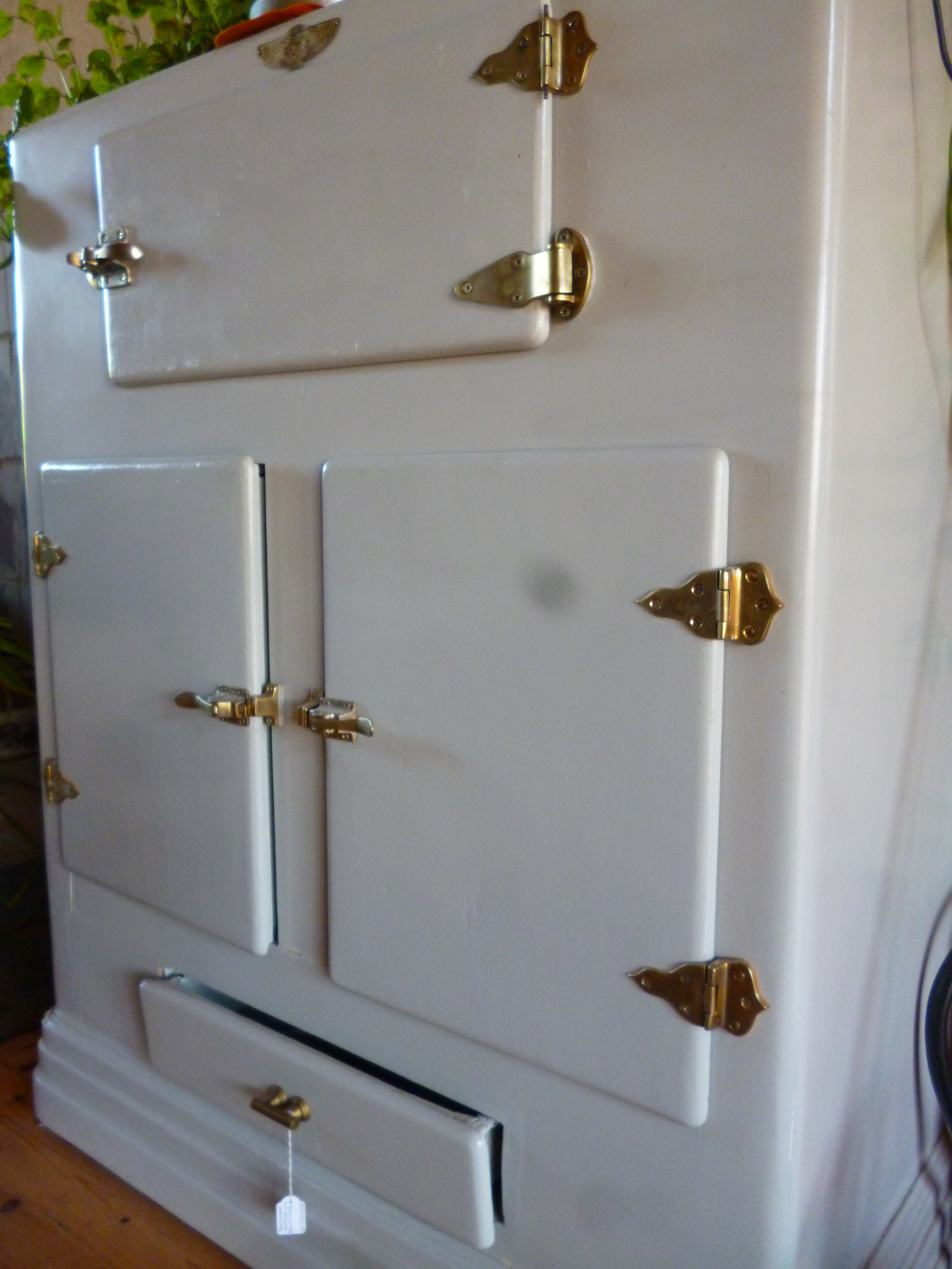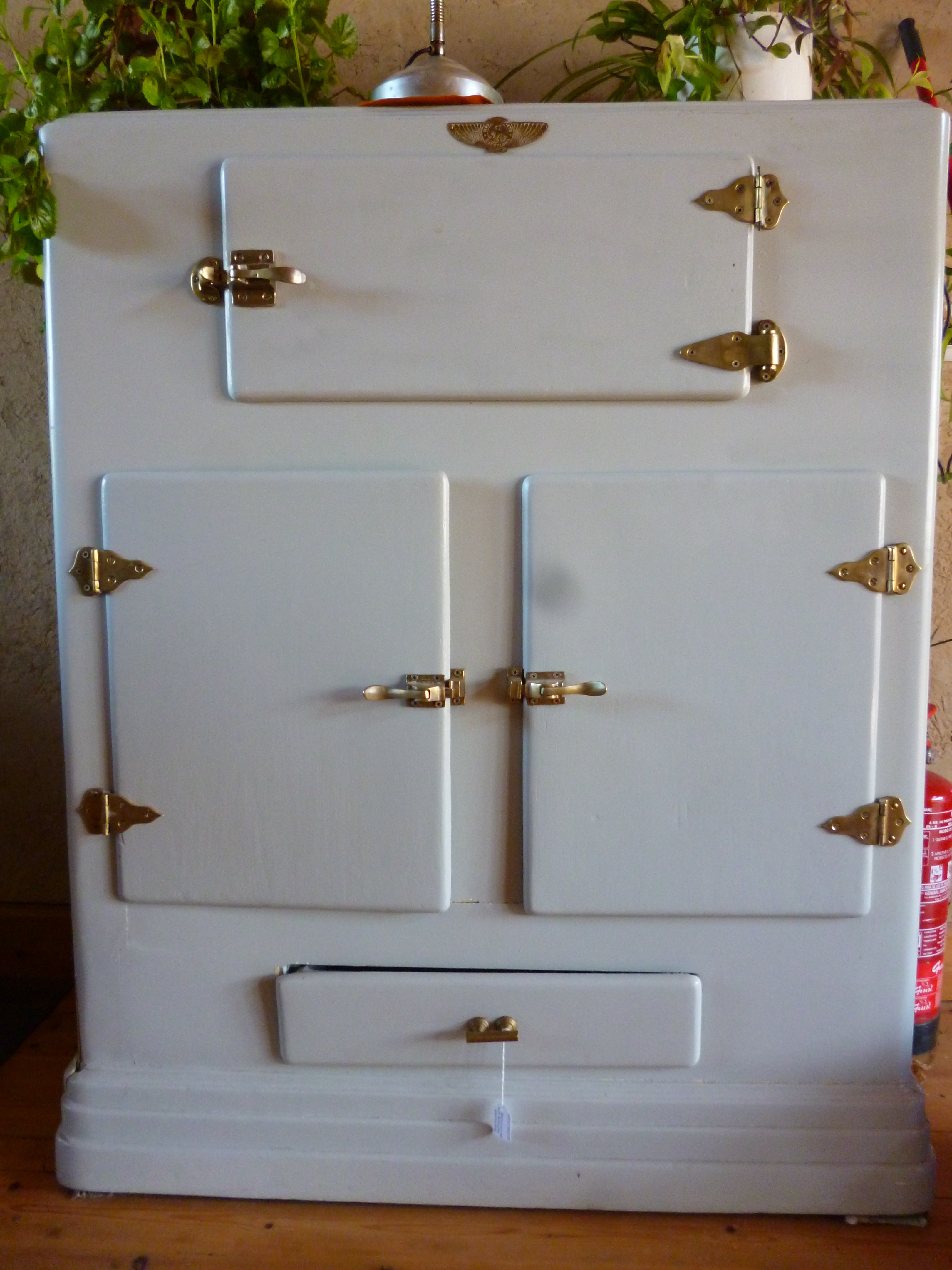 • Nevera barra fresquera antigua, lacada en gris perla, con bisagras y cierres en latón.