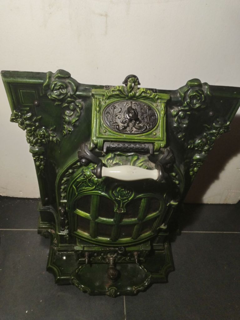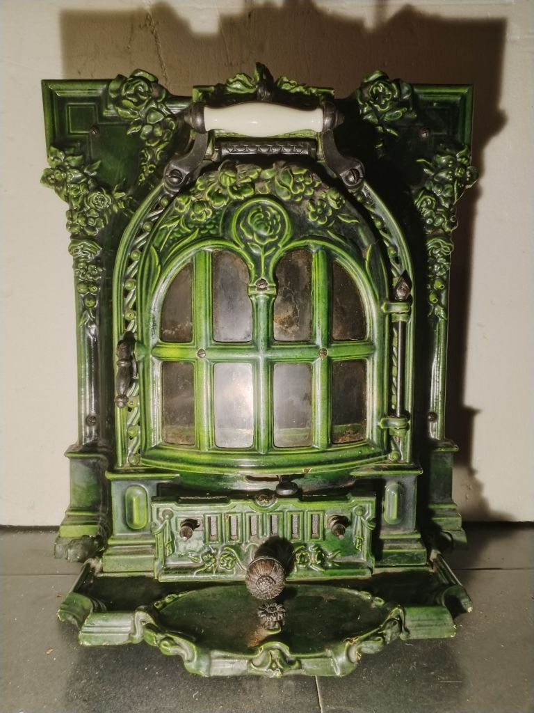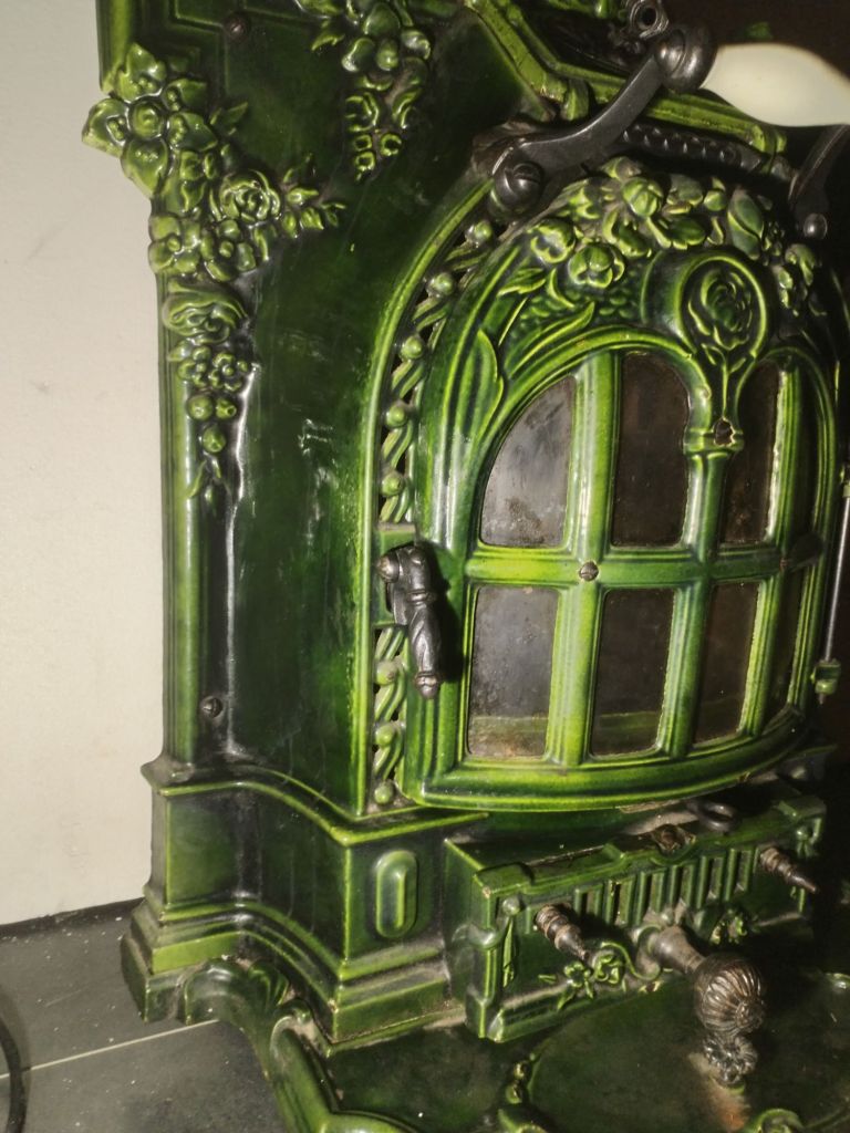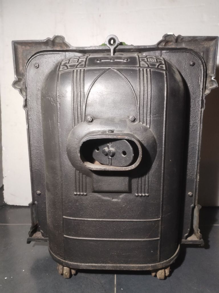 Estufa antigua de fundición, con puerta accesible al hogar, tirador de porcelana Hueso, cajón de cenizas, tiro de corriente, 3 ruedas para trasladarla, Se conserva en perfecto estado, con muy poco uso.
