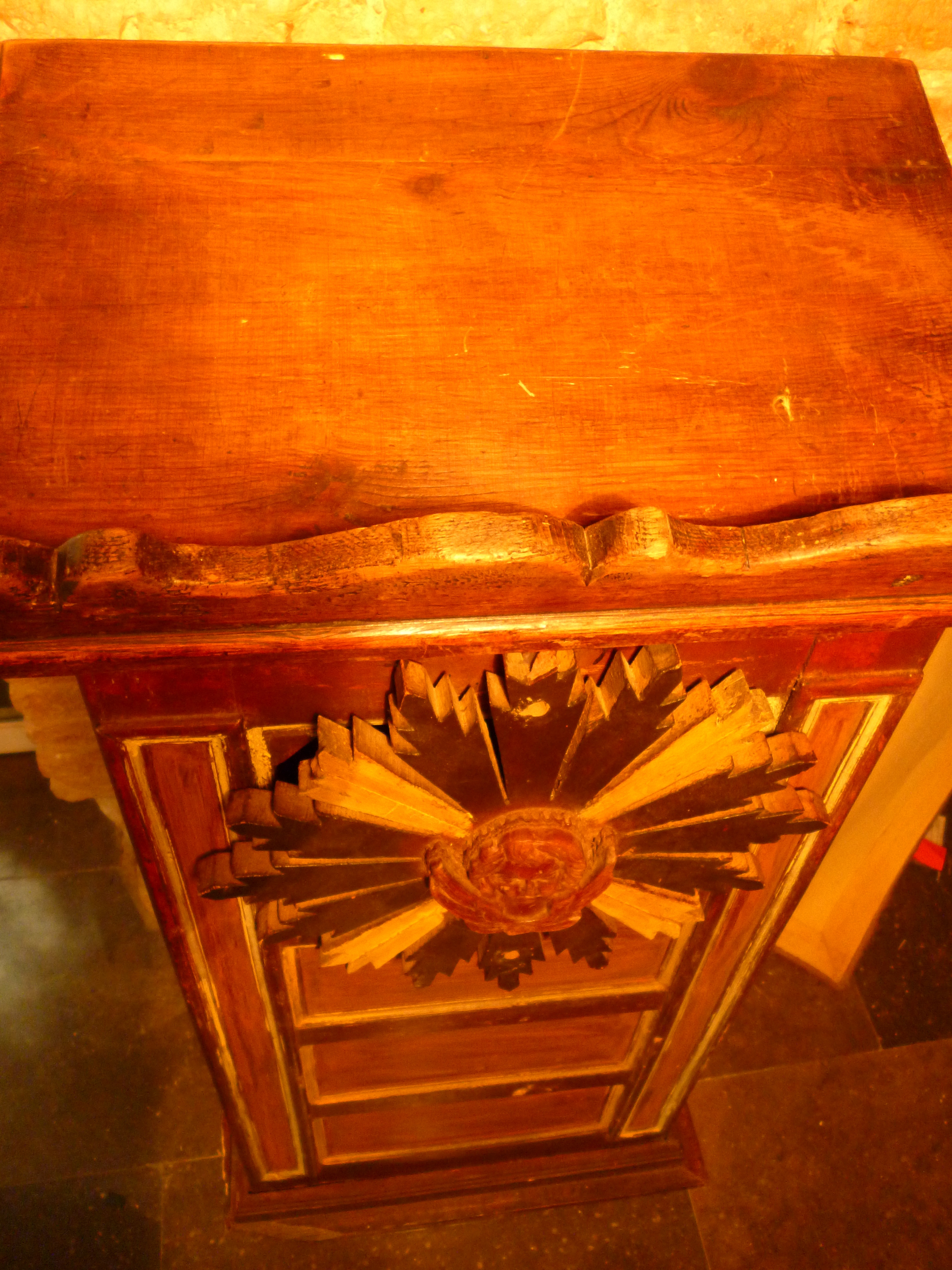 Atril antiguo de Iglesia para misa, en Madera y policromia con rosetón y luz interior.