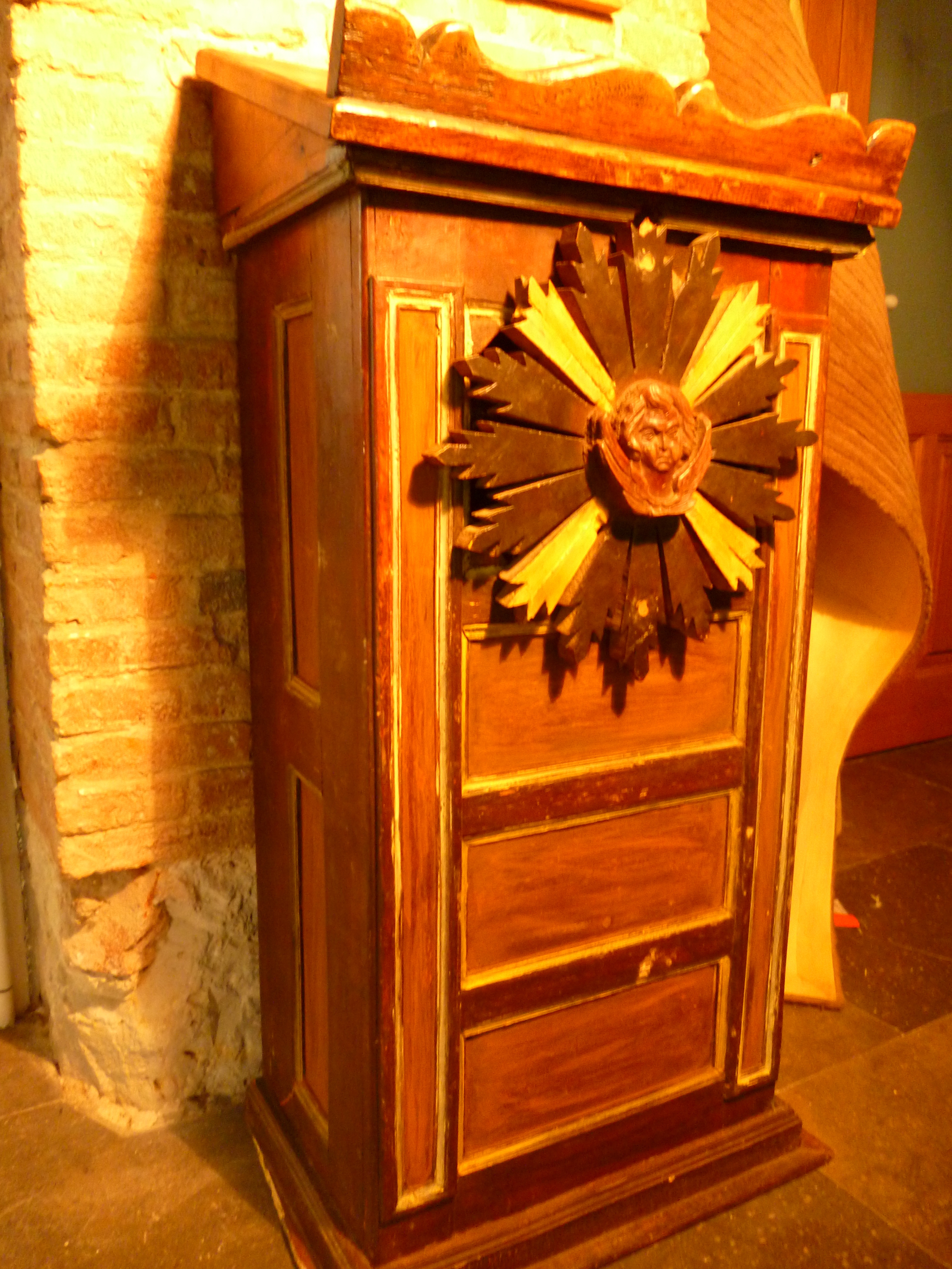 Es de cuando el cura daba las misas de cara al Altar, que es la zona que esta decorada con el Roseton de Madera policromado, dejando entreber unos huecos por los que se veria la luz interior, que quedaria de cara a los fieles de entonces, es una pieza antigua de una Iglesia Castellana