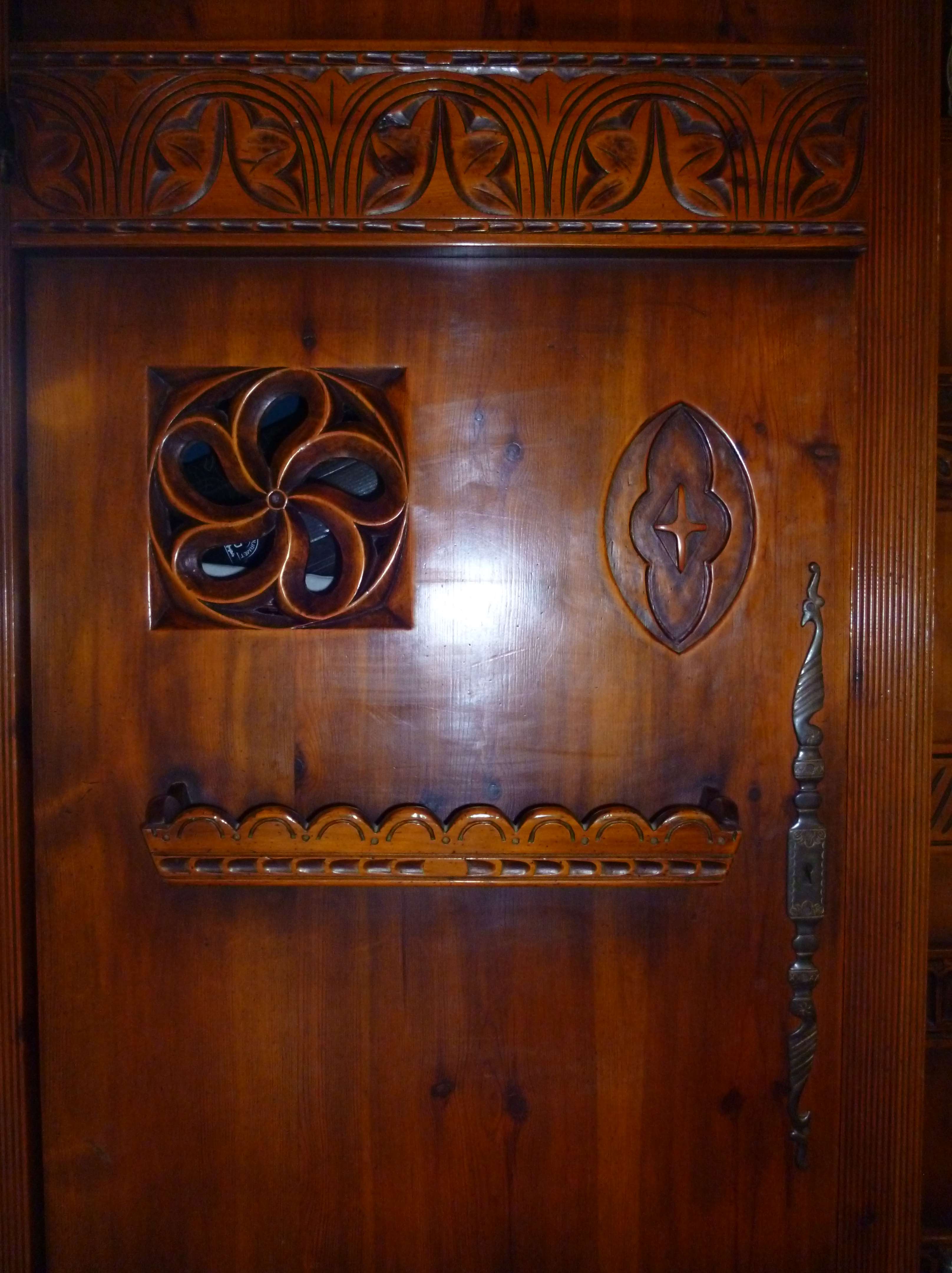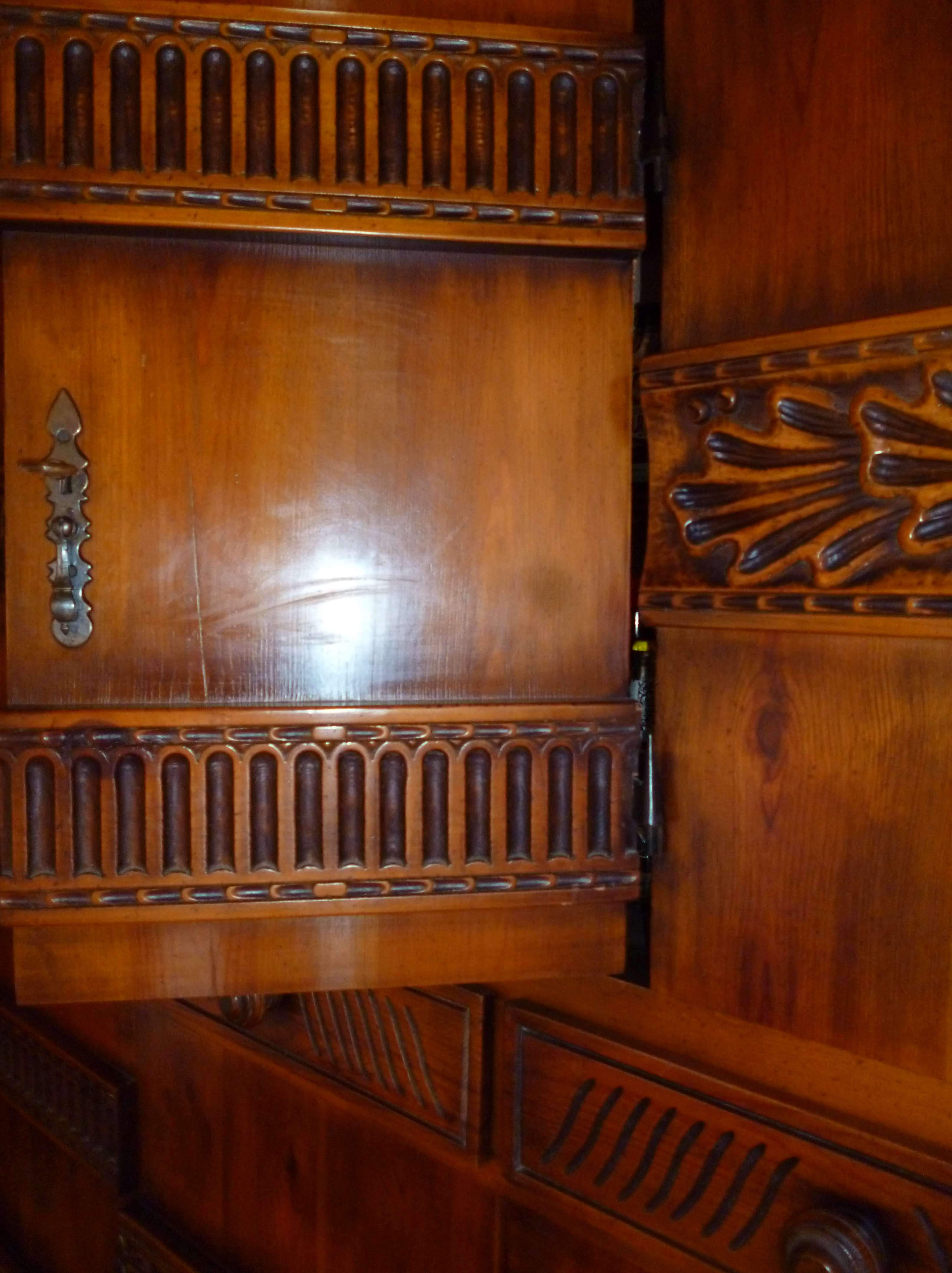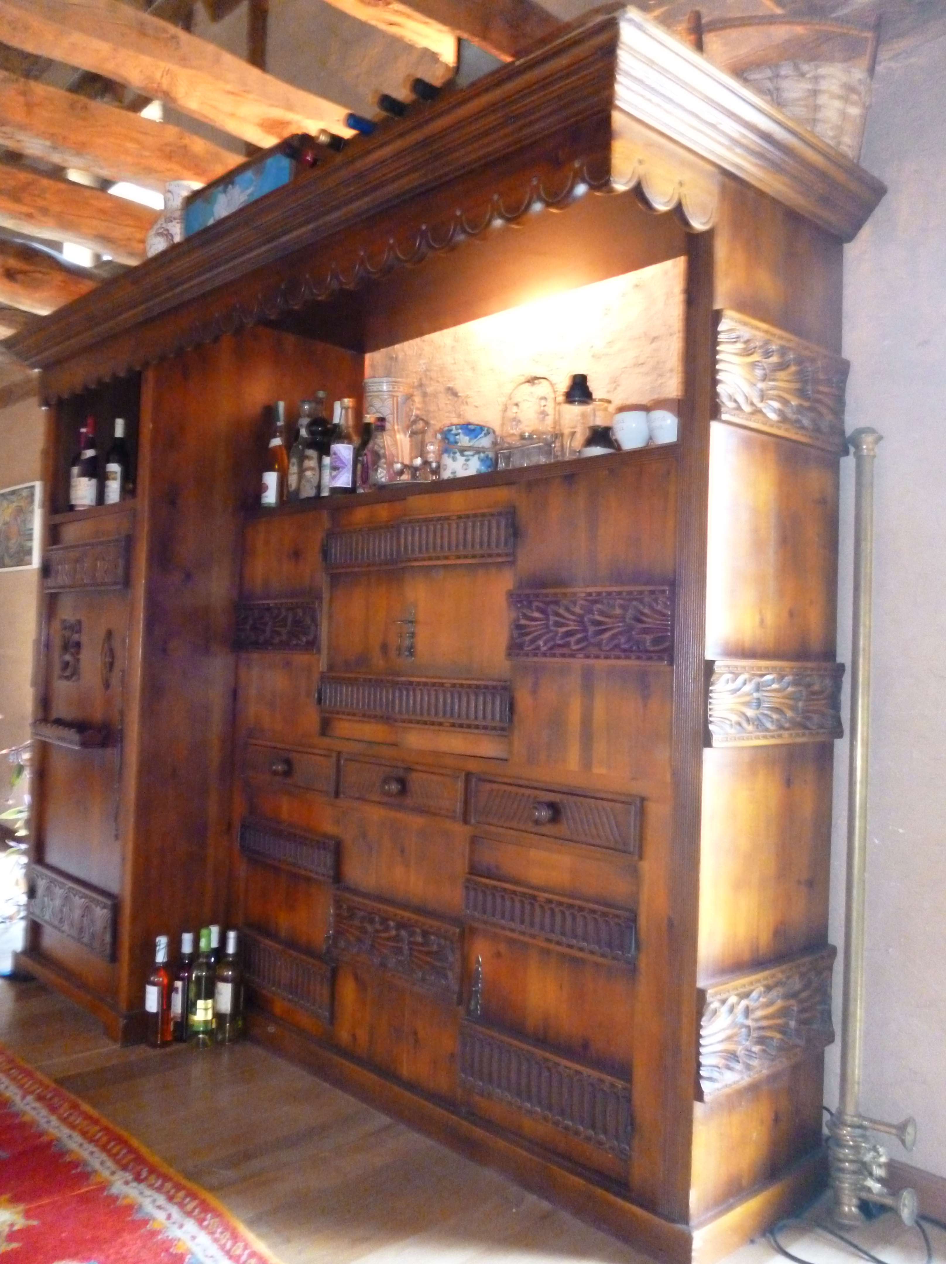 Tallas artesanales en relieve y tiradores de Fundición en bronce. Dispone de múltiples cajones y puertas con cerradura y llaves, con puerta con un hueco grande ( ancho 65 x altura 140 centímetros ) para Armario o para poder albergar una posible nevera, gran botellero, etc.