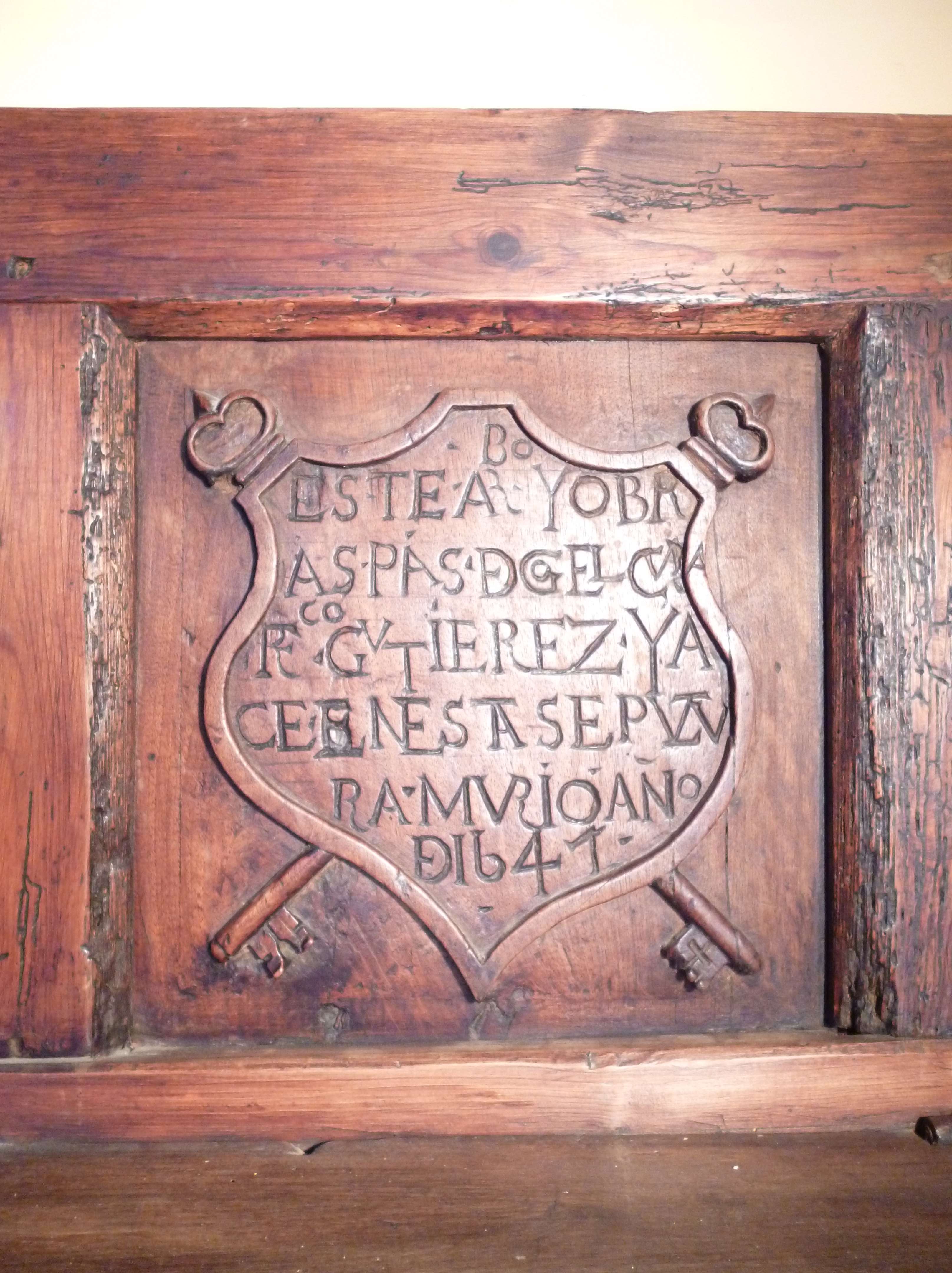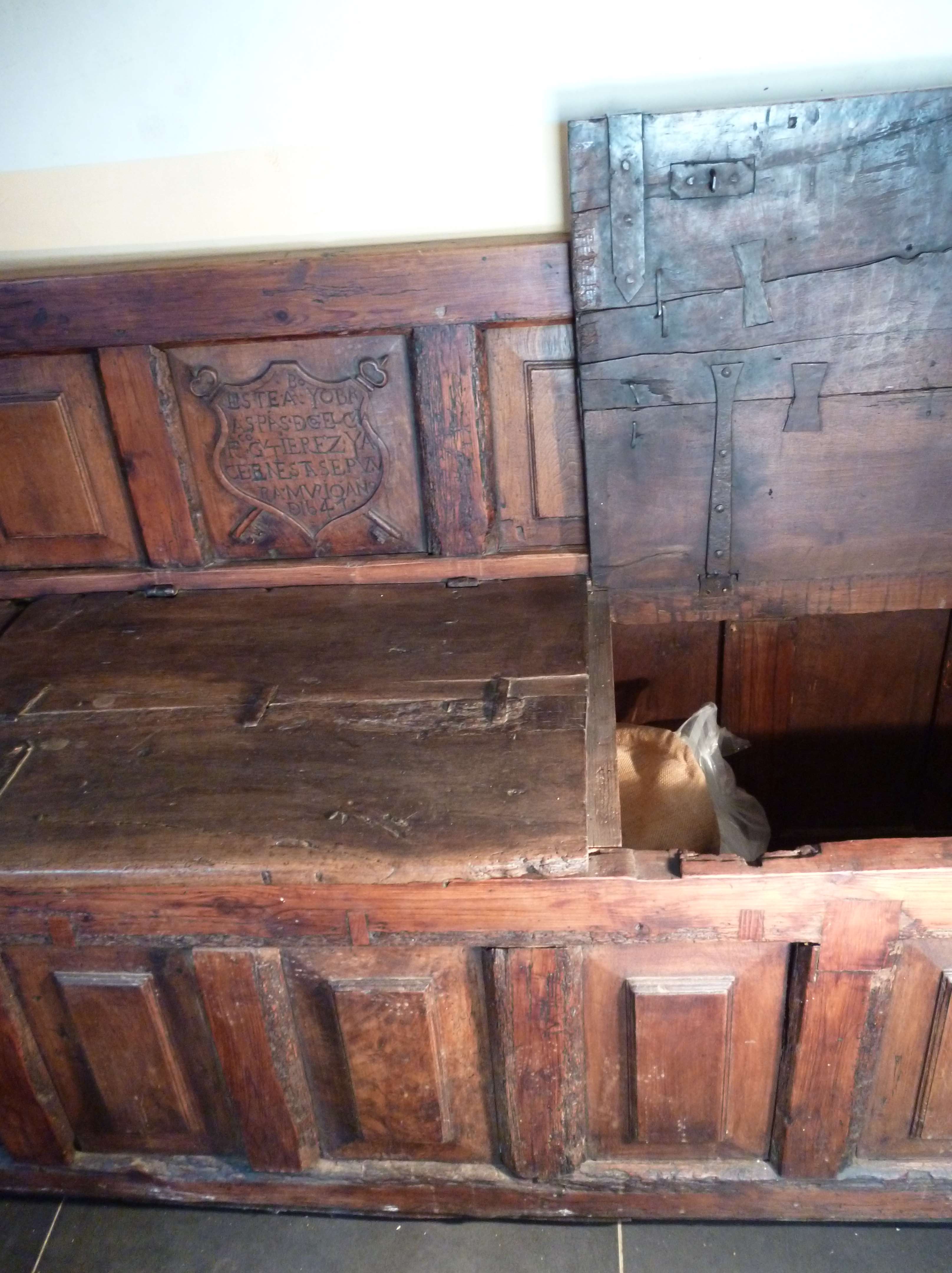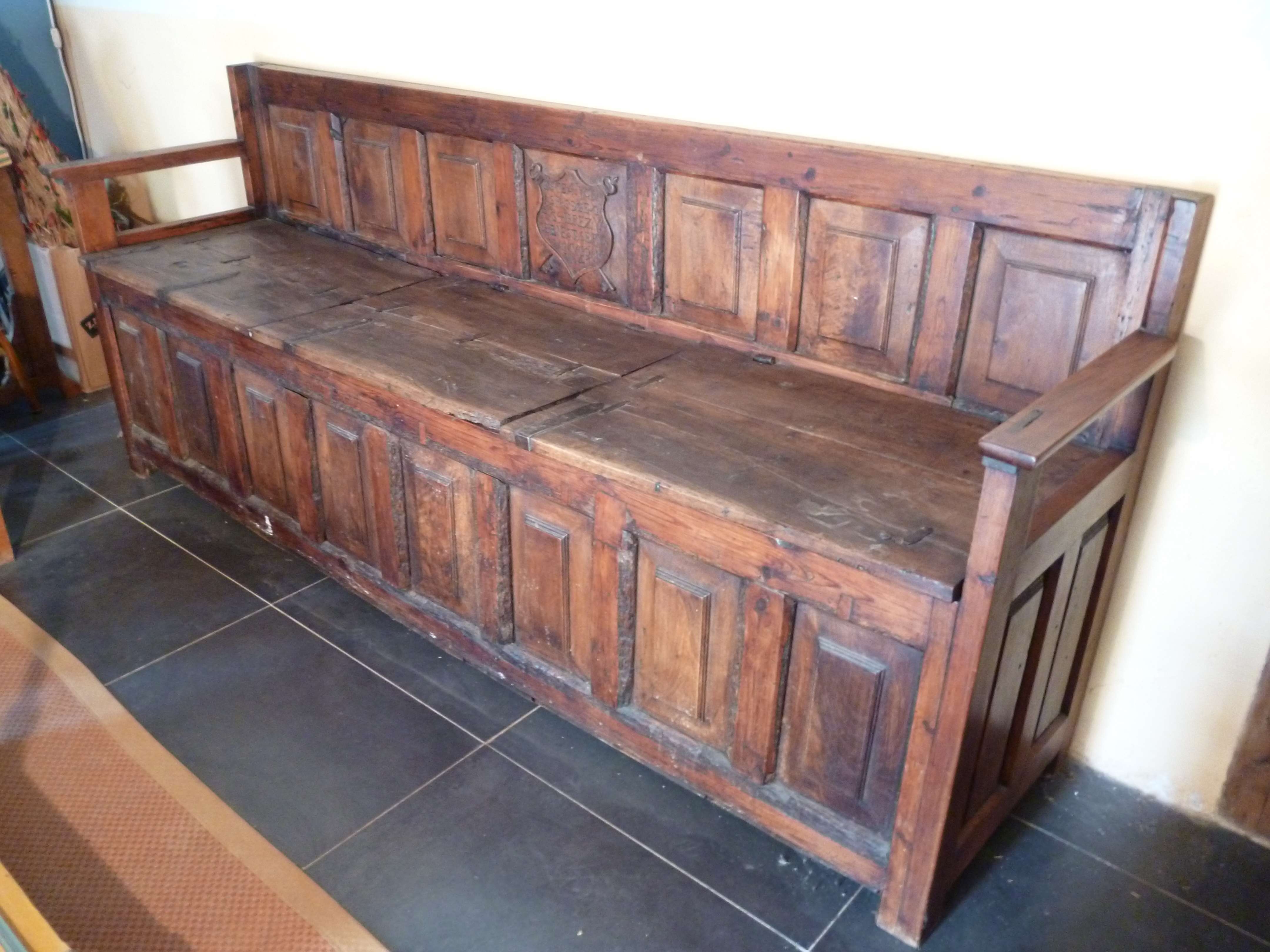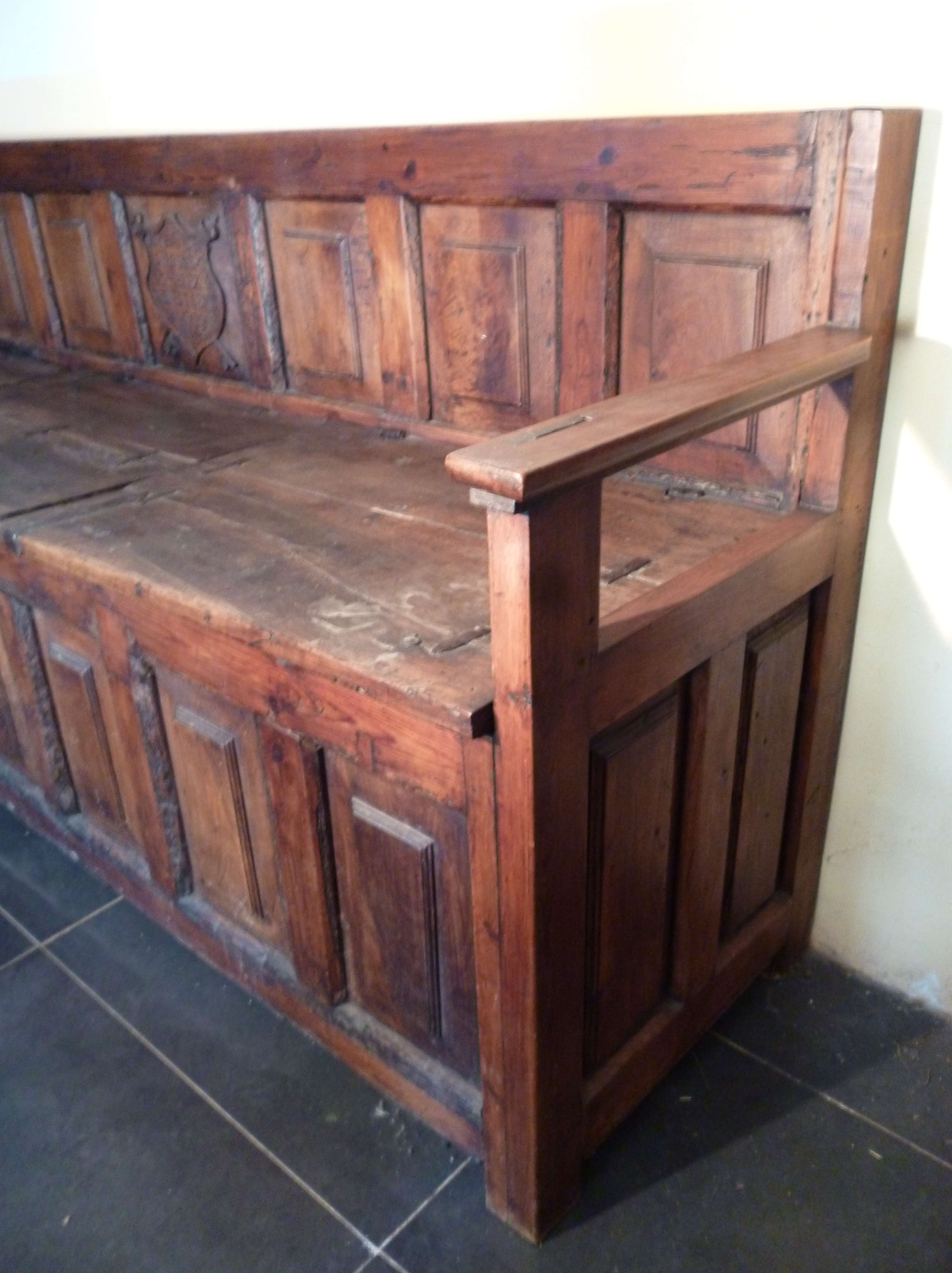 Banco arcón del 1641, de gran tamaño con tres puertas sobre el asiento. Tiene leyenda tallada de autenticidad del autor. Exclusivo y único.