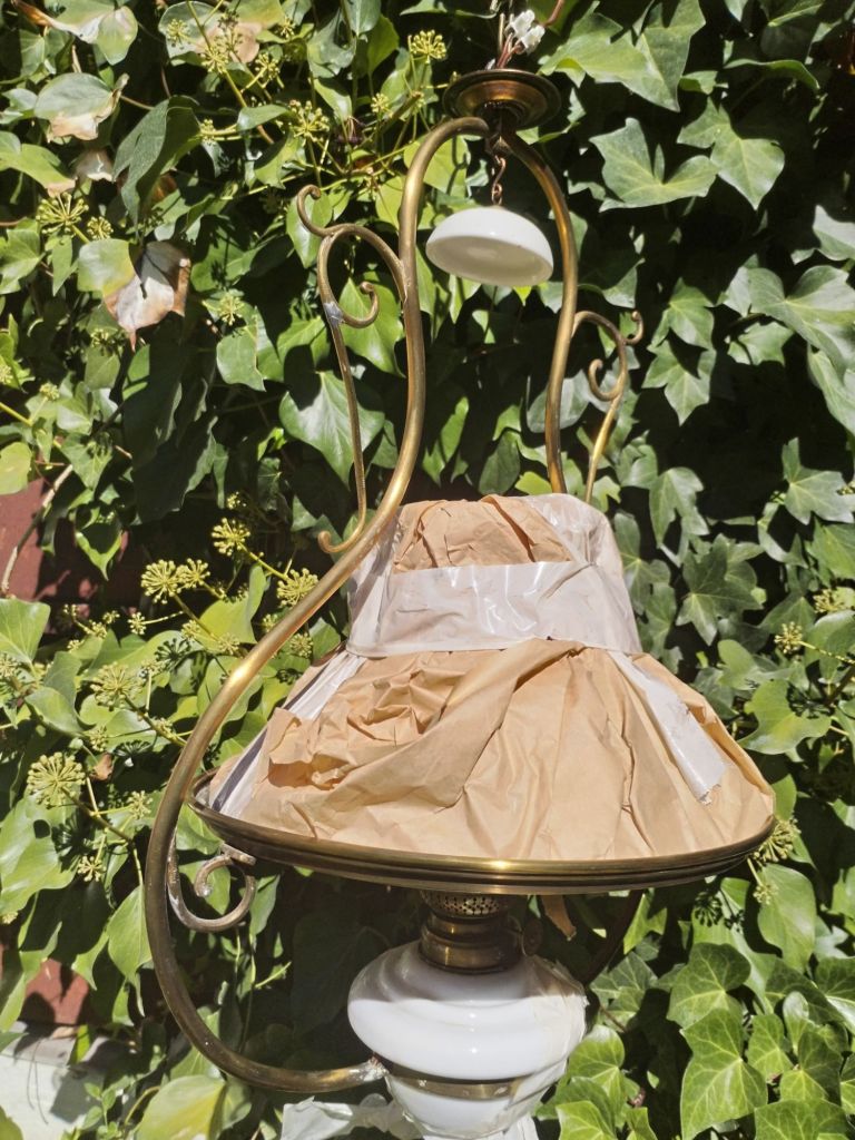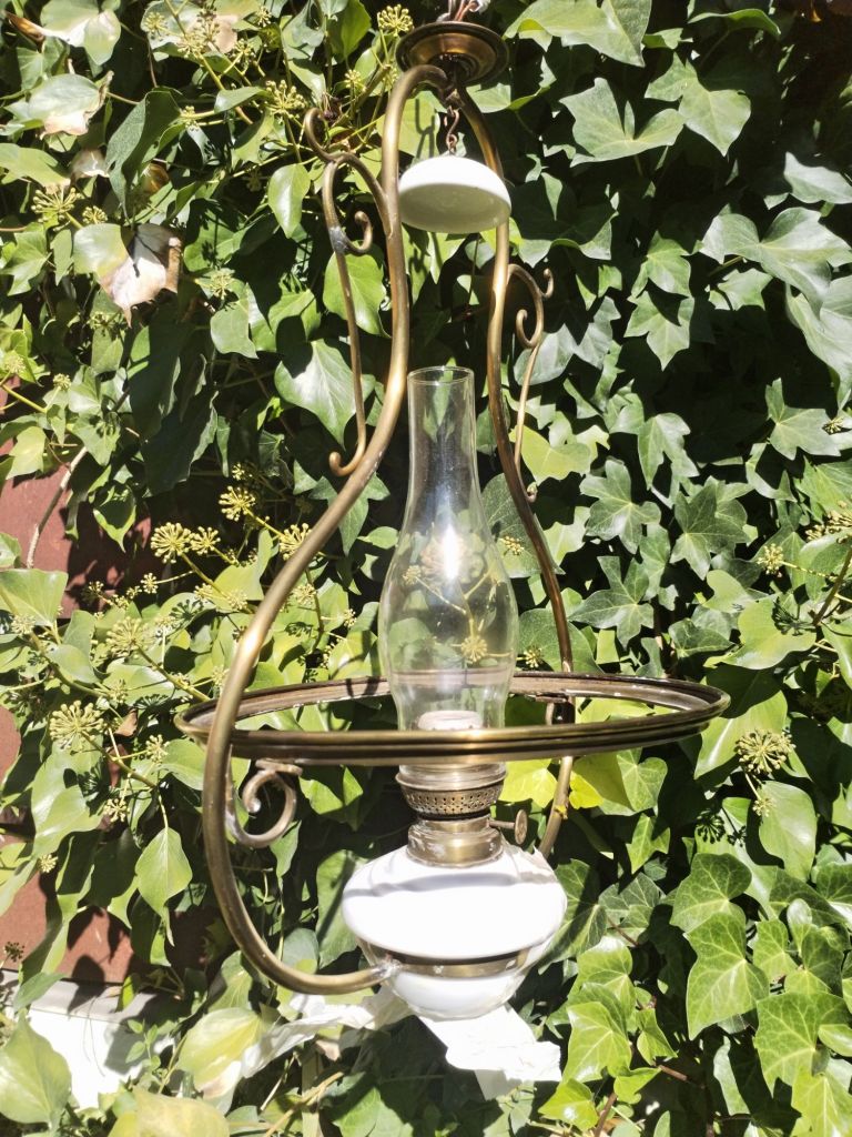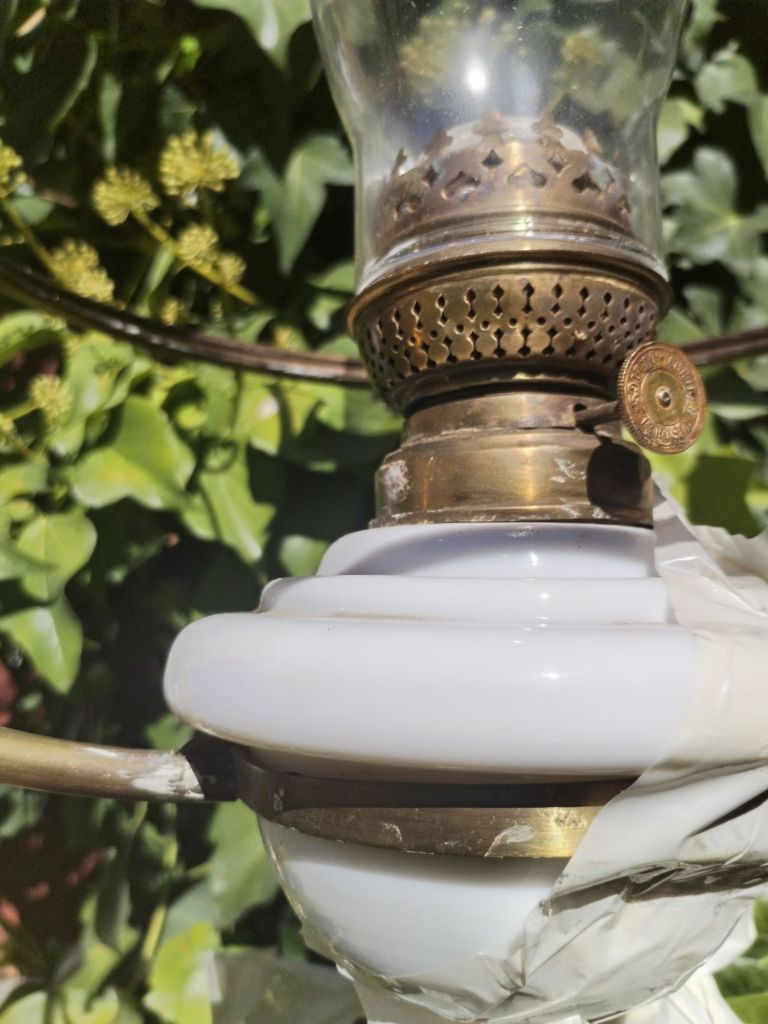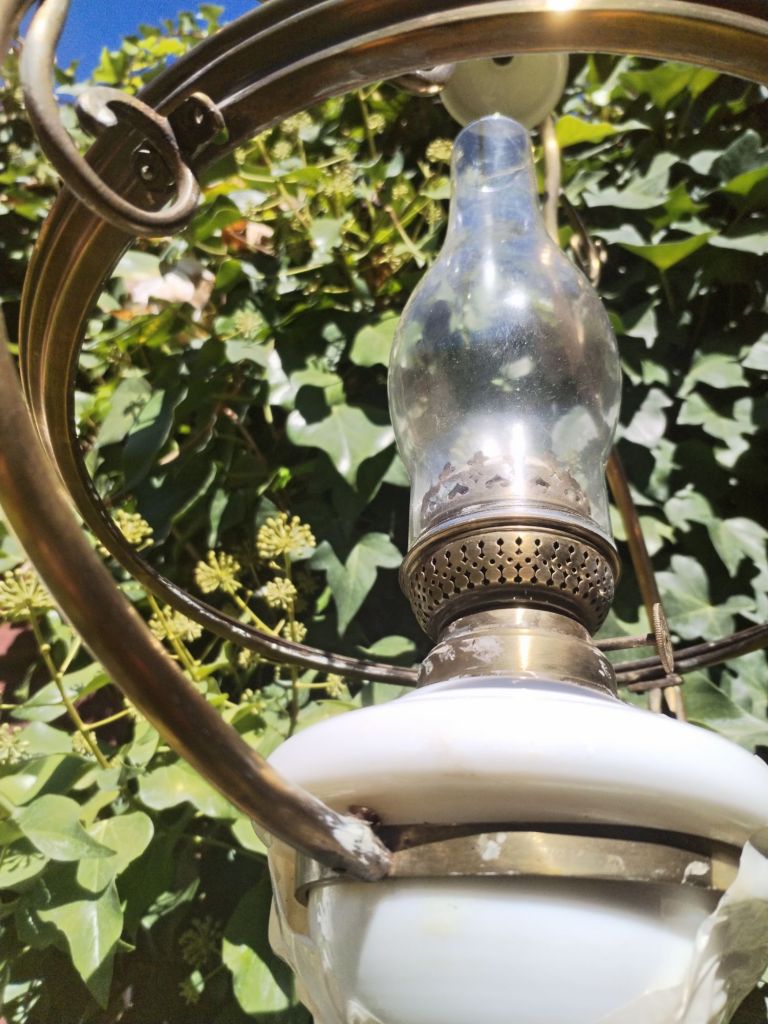 Lámpara de techo de tipo quinque realizada a principios del siglo pasado en laton pabonado y cristales de opalina blanca.