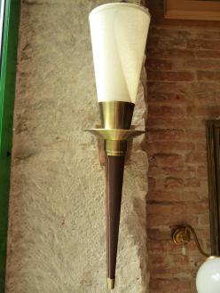 Aplique de pared bombillón. Pieza sin uso a estrenar fabricada en los años 70. Estructura de pared sujeción en metal lacado en granate. , bombillón realizado en cristal mate con casquillo hecho en latón. Medidas: 42 alt x 28 fondo y 22 cm de anchura. Rf: 2019025 Ap