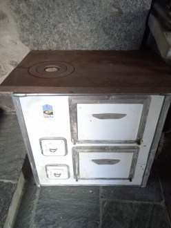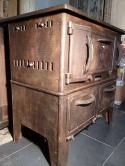 REF: ANTOB‐0005 ART: Cocina ALBA‐3  con sello de autenticidad en puerta delantera DESC:. Estufa de fundición en hierro macizo, encimera con 5 fuegos y tapa deposito para calentar los líquidos, con cuatro  puertas, hornos independientes y calderín con grifo de  agua caliente. Rejillas laterales para controlar el tiro de la Estufa MED: 85x84x alt. 55cm.      PVP: 1650 €