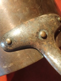 Sartén de cobre con asa de latón macizo en fundición e interior acto para cocinar. Med: 25 diametro x 5’5 alto mas largo del asa de laton. 95 € Cazuela antigua con dos asas de hierro fundido. medida: 33 diámetro x 8 cm de altura. 55 € Piezas de Hosteleria Profesional