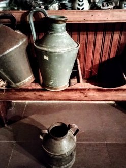 Mueble cantarera antiguo, de madera con estantes y parte baja con estantes adaptados para albergar los cántaros y aceiteras. Med; 126 x 40 x alt 208 cmt Pvp: 790 € Tres cántaros de metal, zinc y latón. Cantaro zinz y laton Med: alt 42 cmt diam, 24 Pvp: 56 € Dos cántaros de metal, Aceiteras, medidas alt 42 x 24 grande 46 € Med, peq. alt 29 x 20 diam. 38 €