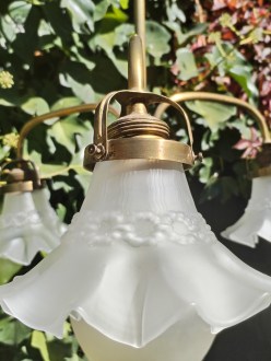 Lámpara antigua de techo con tres flores modernistas. Realizada en latón pulido mate. Con colección de tulipas antiguas artesanas posibilidad de variar las sobre todo la central + grande ( 7’5 cmt diametro, para tornillo ) y con colgantes Reinstalada el cableado interior. Altura setenta y dos centímetros aprox. 465 €