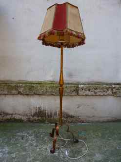 Lampara de pie en latón con tres patas, interruptor de cadena en casquillo. Pantalla de 8 caras en crema y terciopelo rojo y bordones colgantes. Medidas: 170 cm x 50 cm de diámetro PVP: 284 €