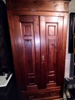 Armario ropero construido en pino macizo. Pintura en blanco roto patinado. Con barra de colgar interior, tiradores, estructura y baldas de madera de Pino patinado. Medidas: 84 x 52 fondo x 206 de alt. 230 €